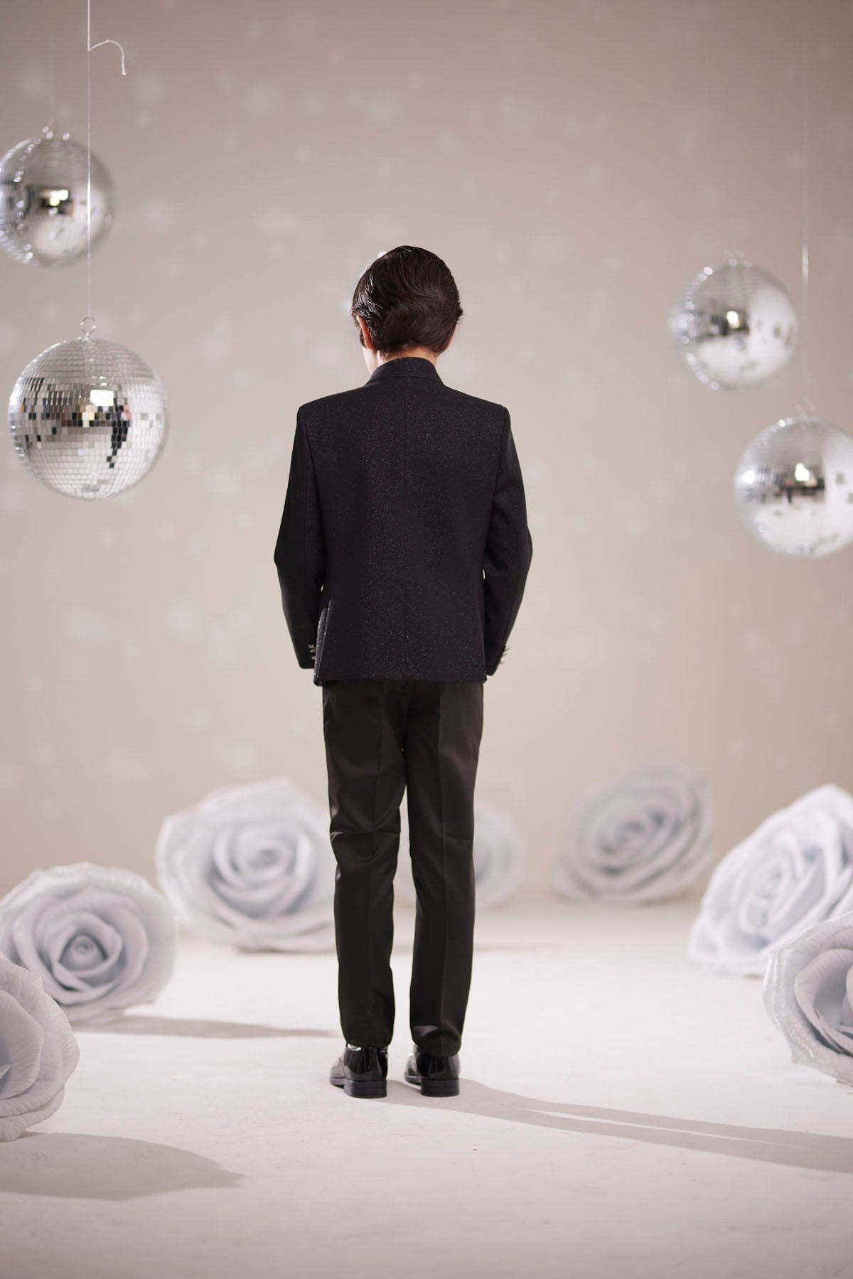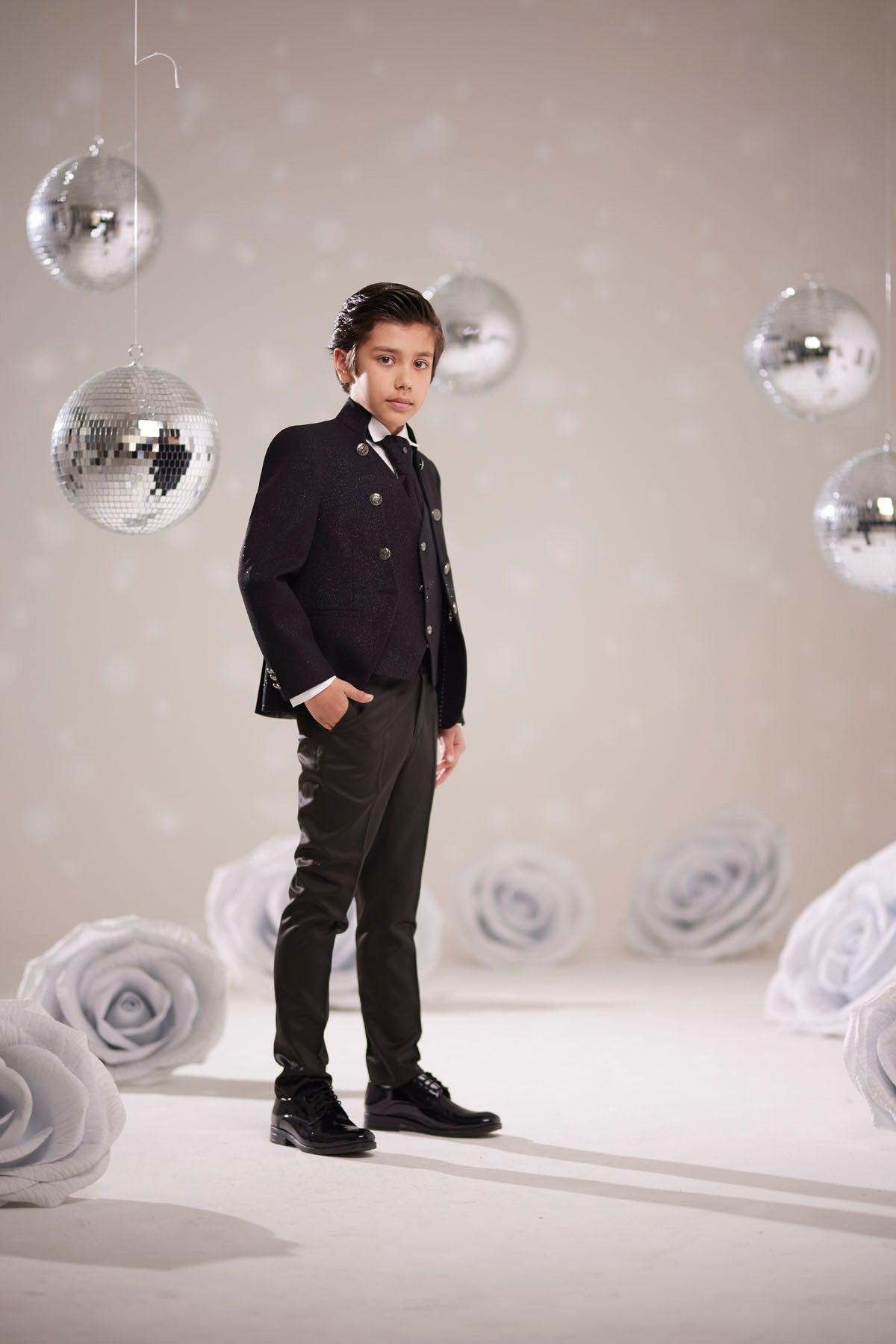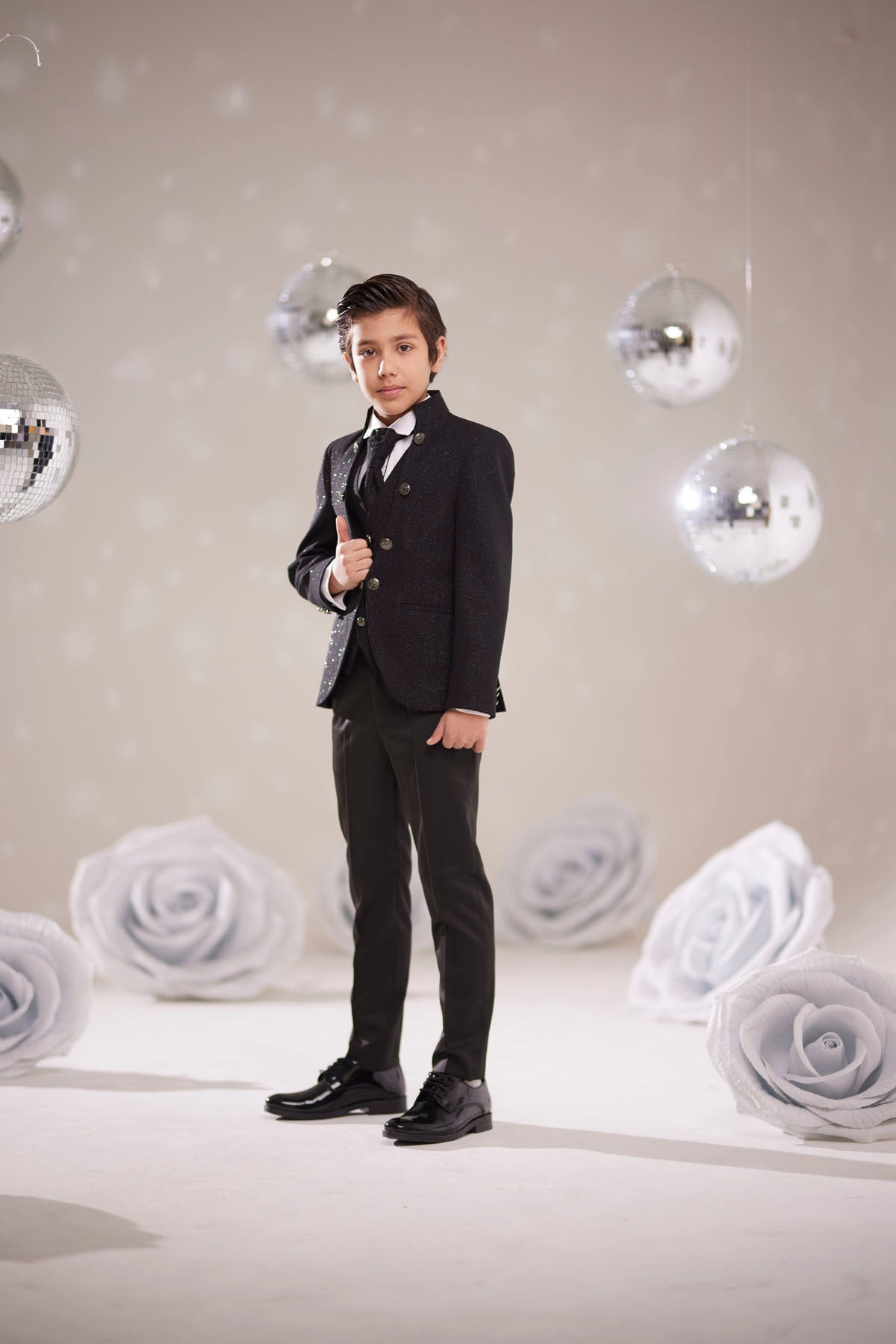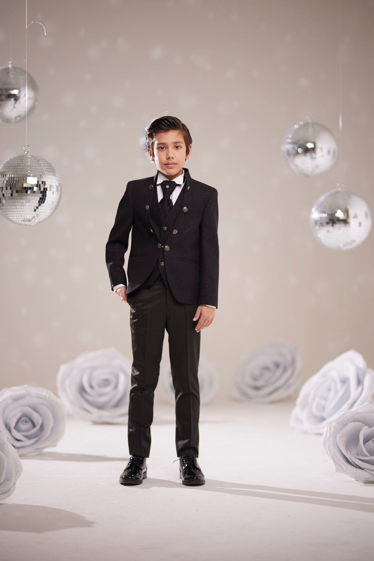 صغير الحجم صُممت هذه البدلة السوداء اللامعة للرجال، وتتميز بقصتها الإيطالية وخياطتها الرائعة. قماشها اللامع يرتقي بالأناقة إلى أعلى مستوياتها في المناسبات الخاصة. تصميمها ذو الأزرار يُضفي لمسة عصرية على التصميم الكلاسيكي. تُكمل هذه البدلة أناقة طفلك في جميع المناسبات الخاصة، من حفلات التخرج إلى الكنيسة أو مراسم التناول، بالإضافة إلى الختان وحفلات الزفاف. تصميمها المريح لا يُقيد الحركة، وبمقاسات تتراوح من 1 إلى 14، تُناسب جميع الأعمار.