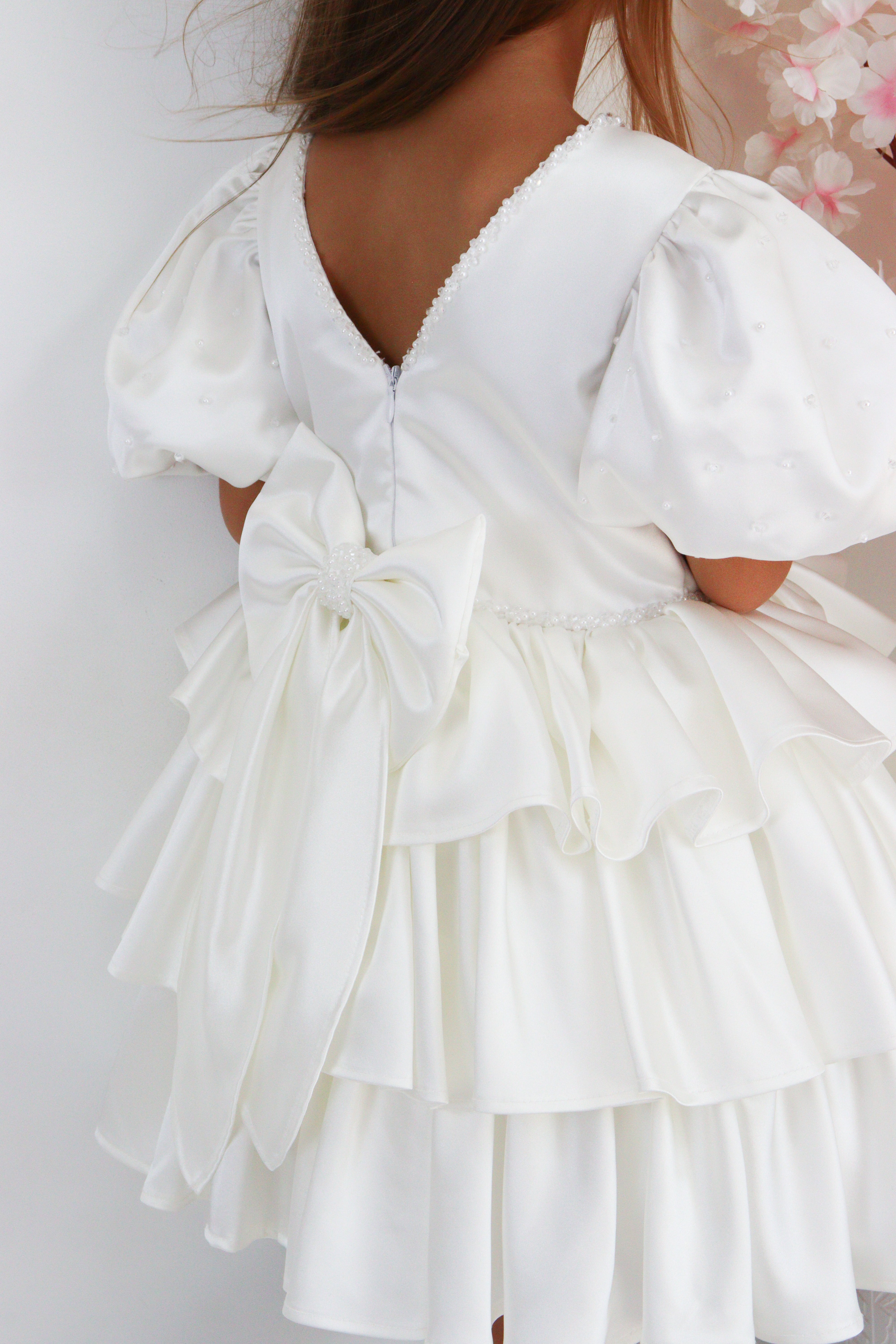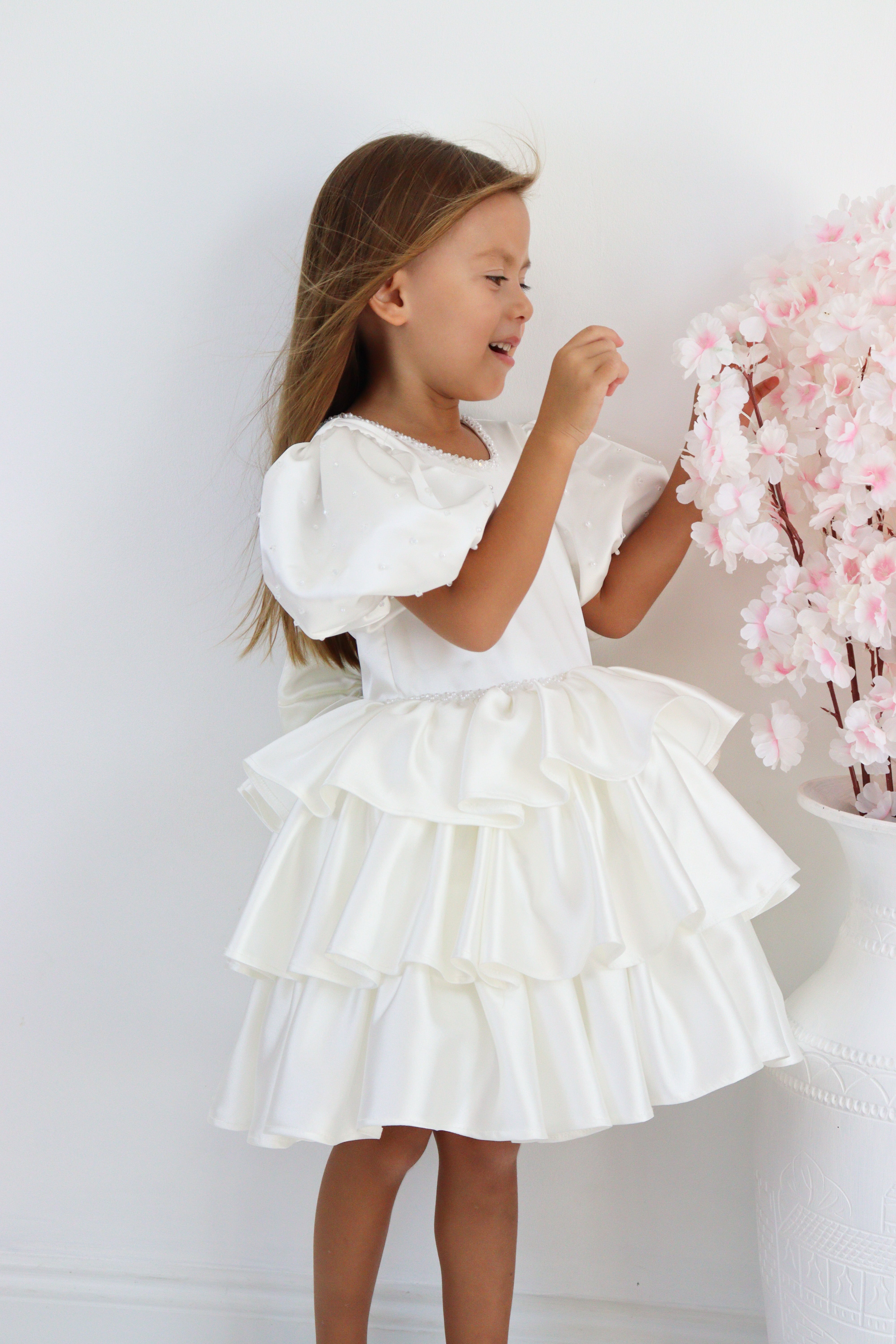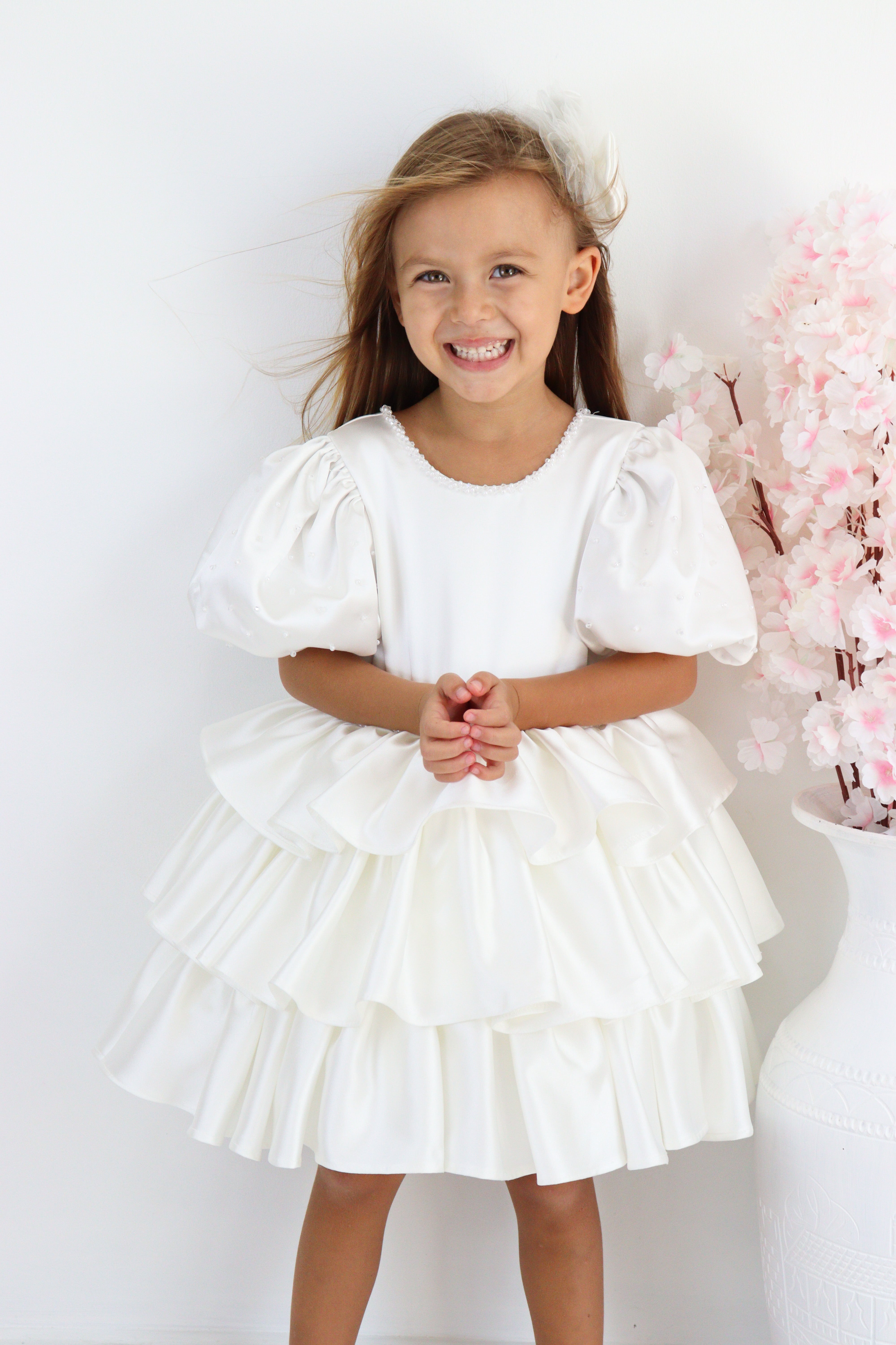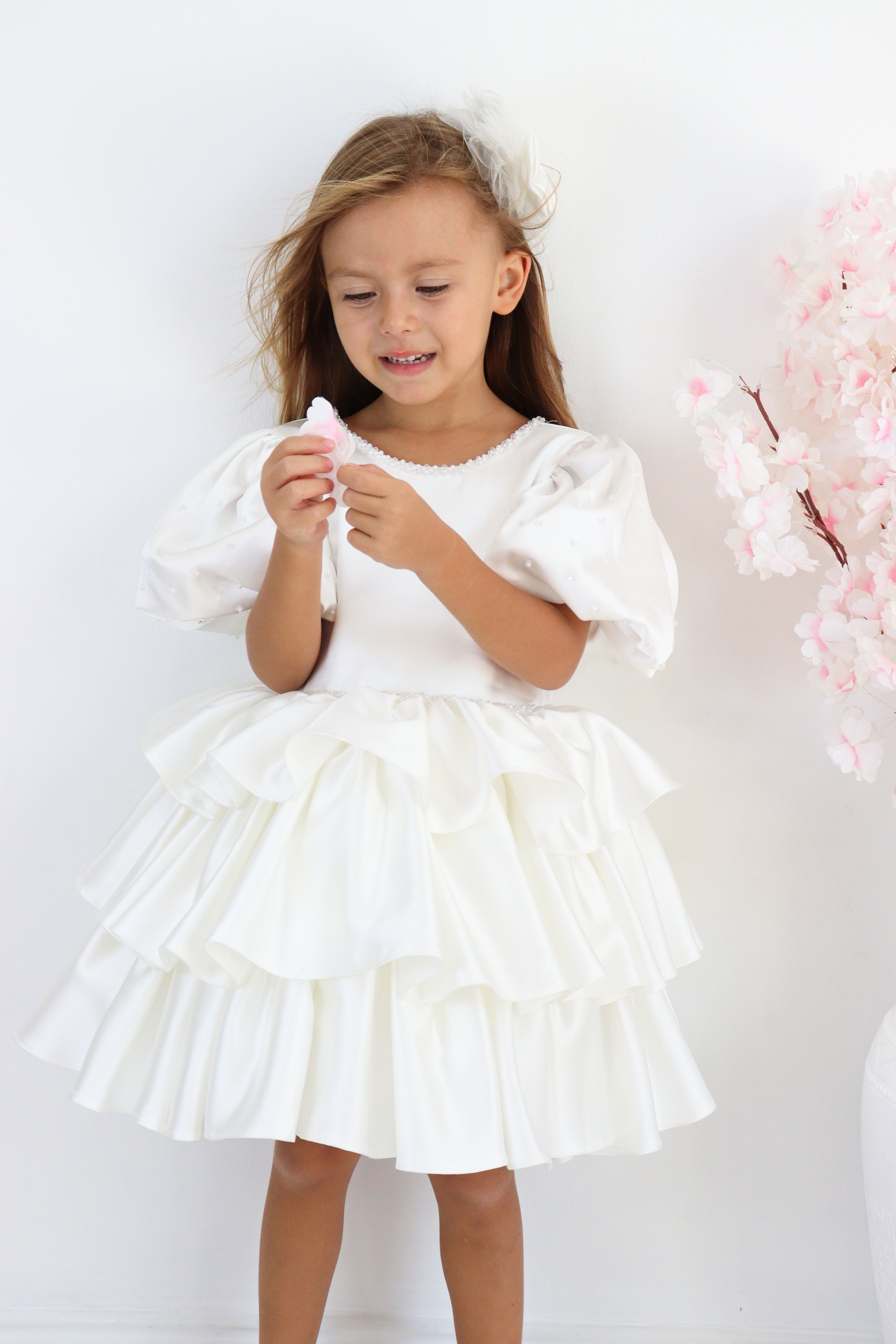 Küçük prenseslerin doğum günü, düğün veya özel kutlamalarda parlaması için tasarlanan bu beyaz saten elbise, zarif ve kabarık görünümüyle dikkat çeker. Kat kat volanlı eteği, kabarık balon kolları ve inci detaylı yaka formuyla asil bir duruş sunar.