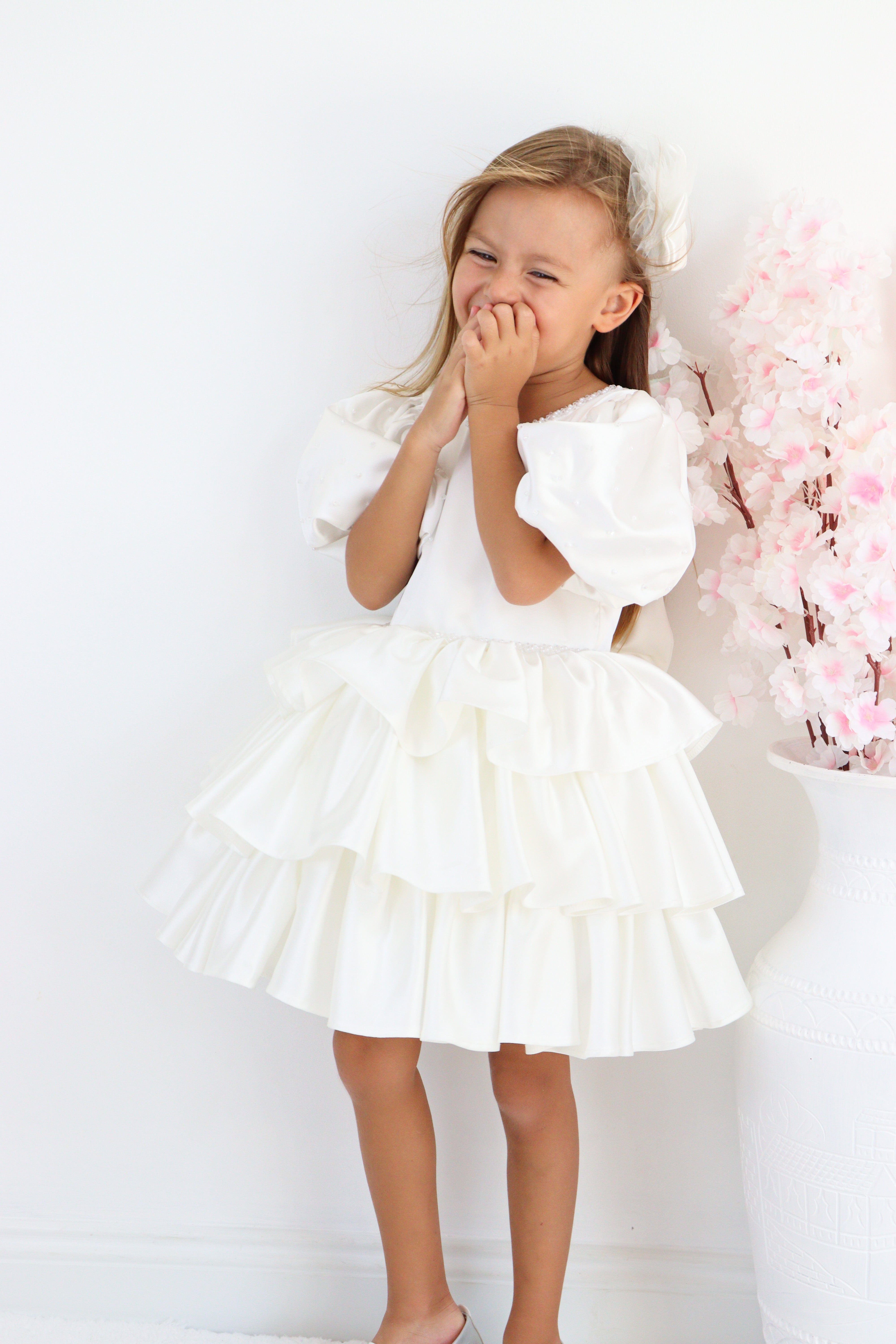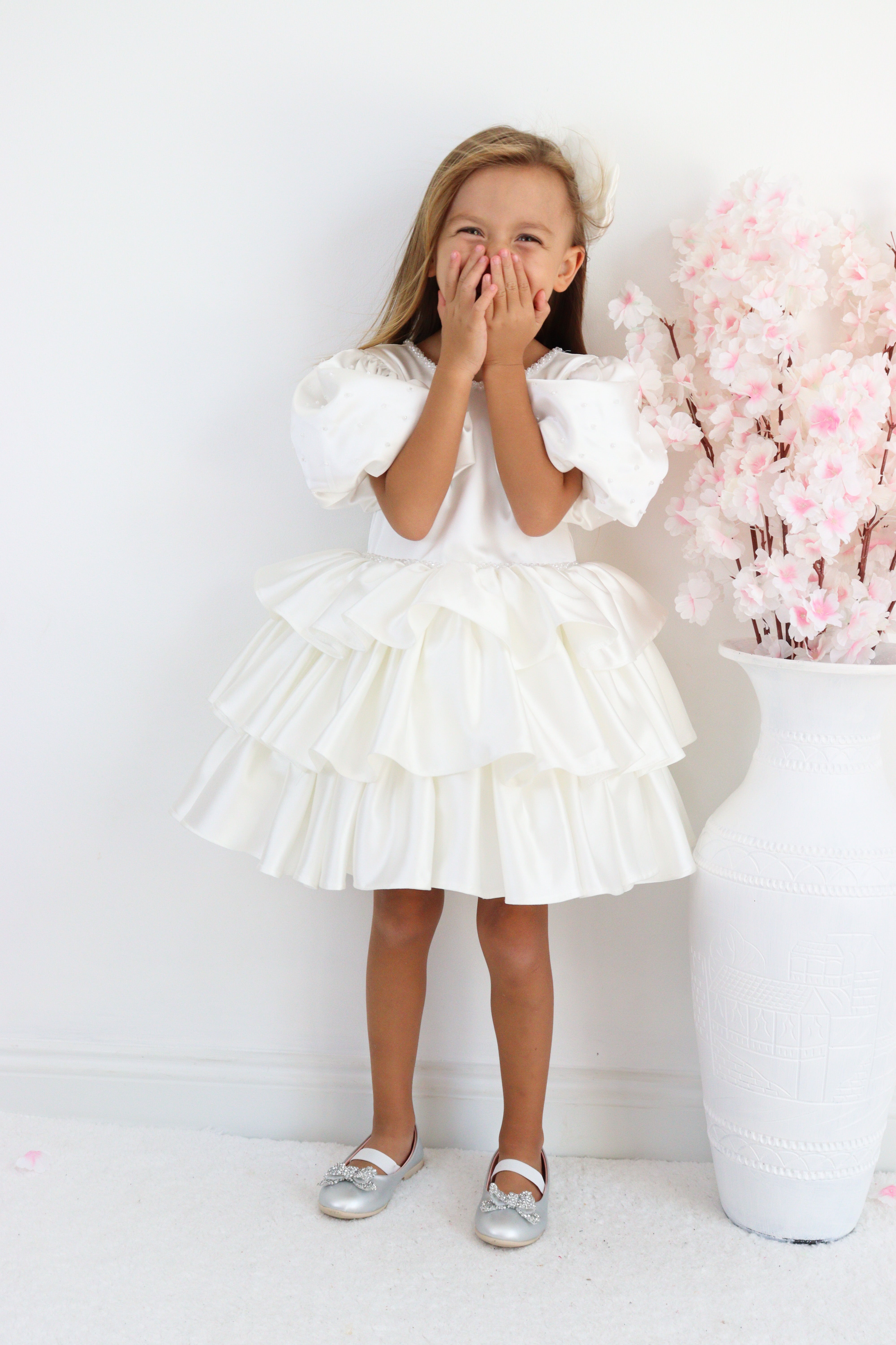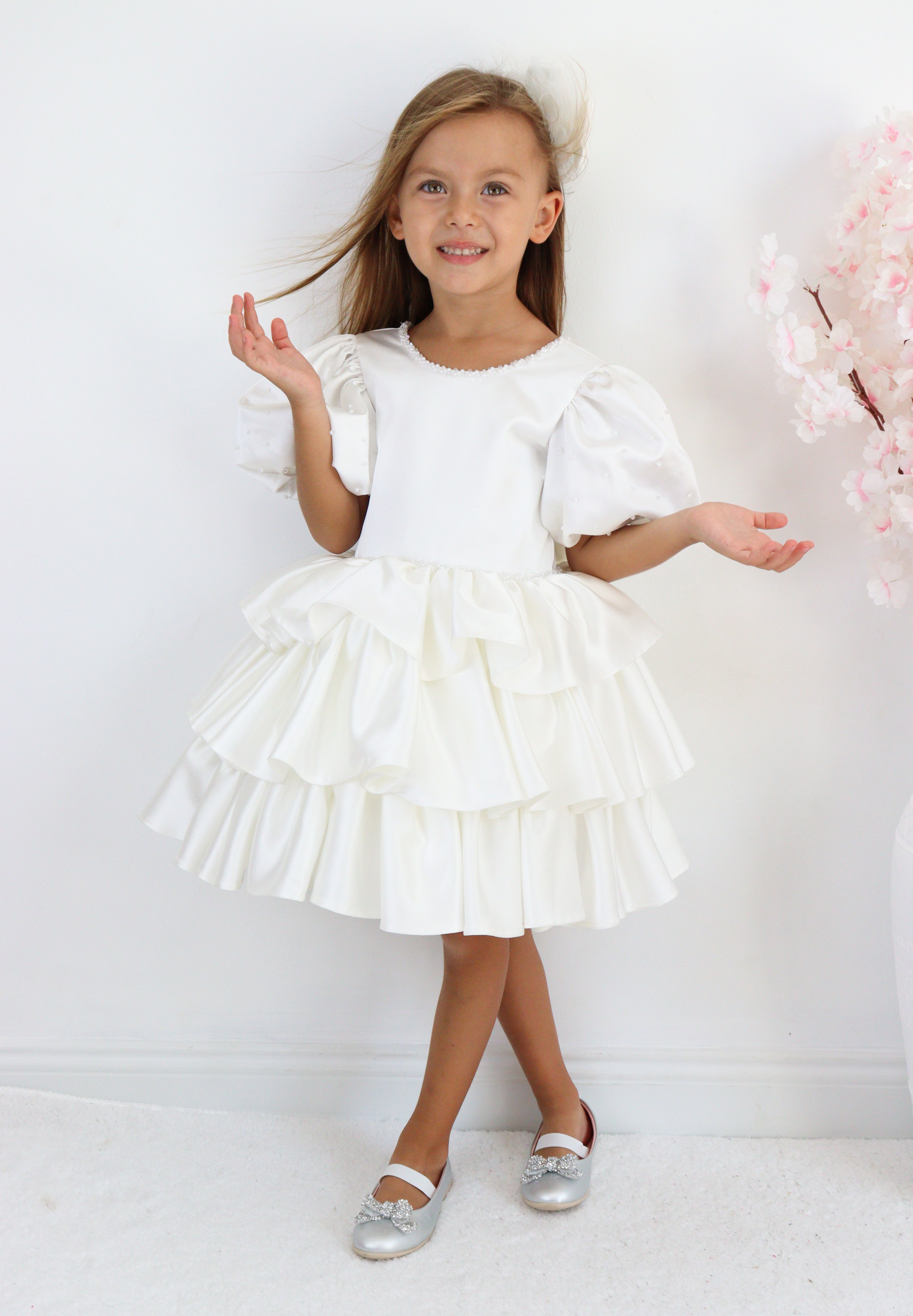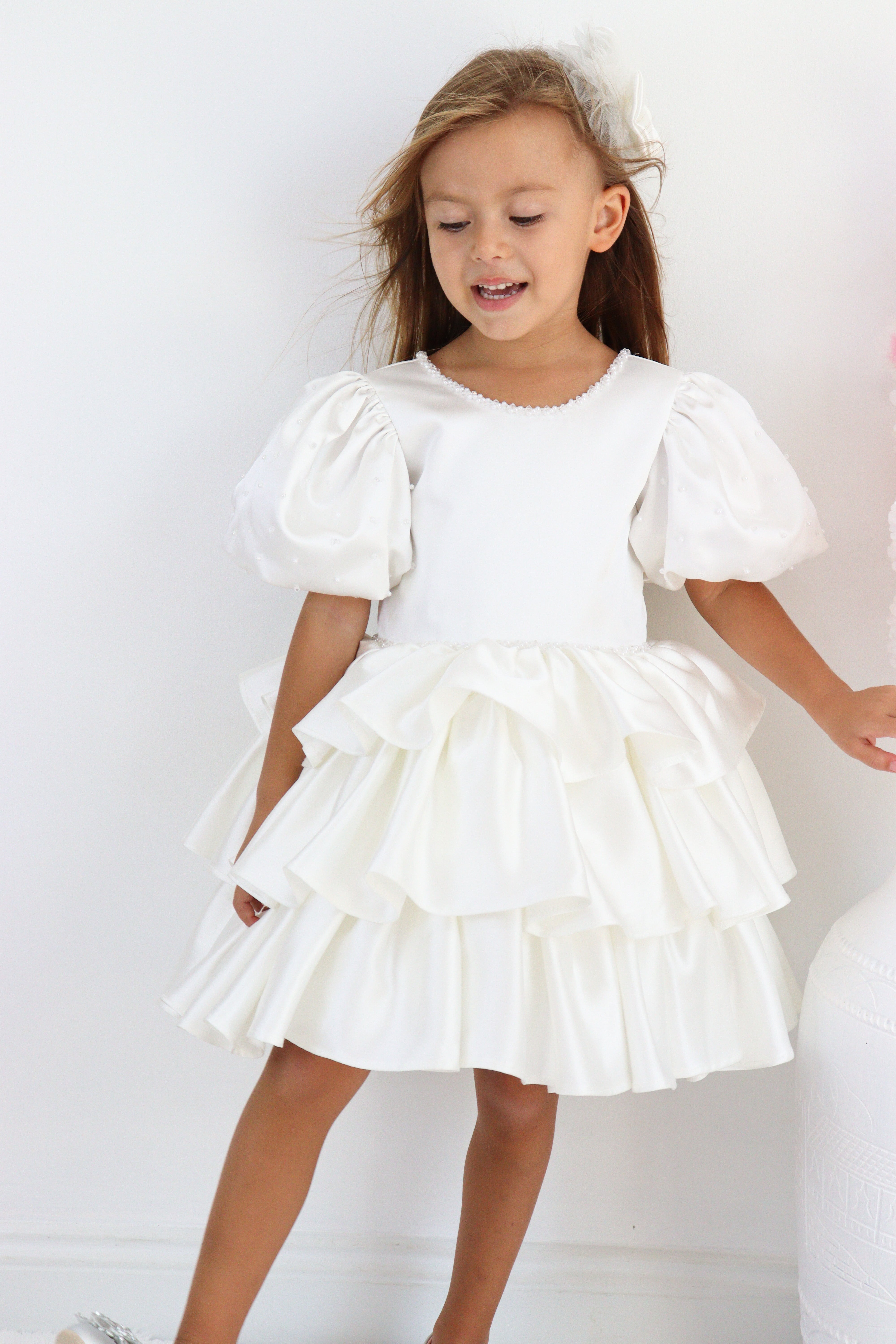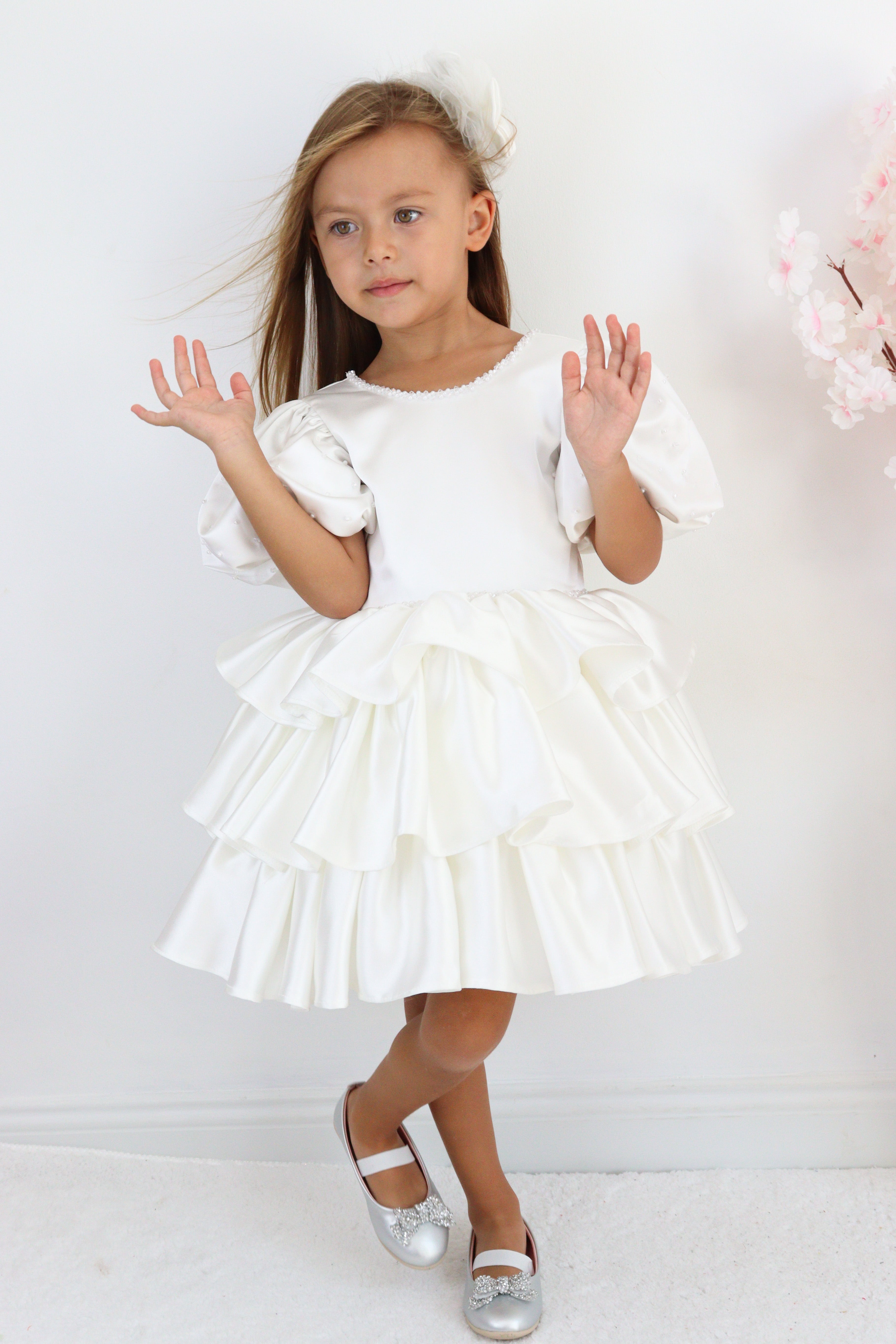 Küçük prenseslerin doğum günü, düğün veya özel kutlamalarda parlaması için tasarlanan bu beyaz saten elbise, zarif ve kabarık görünümüyle dikkat çeker. Kat kat volanlı eteği, kabarık balon kolları ve inci detaylı yaka formuyla asil bir duruş sunar.