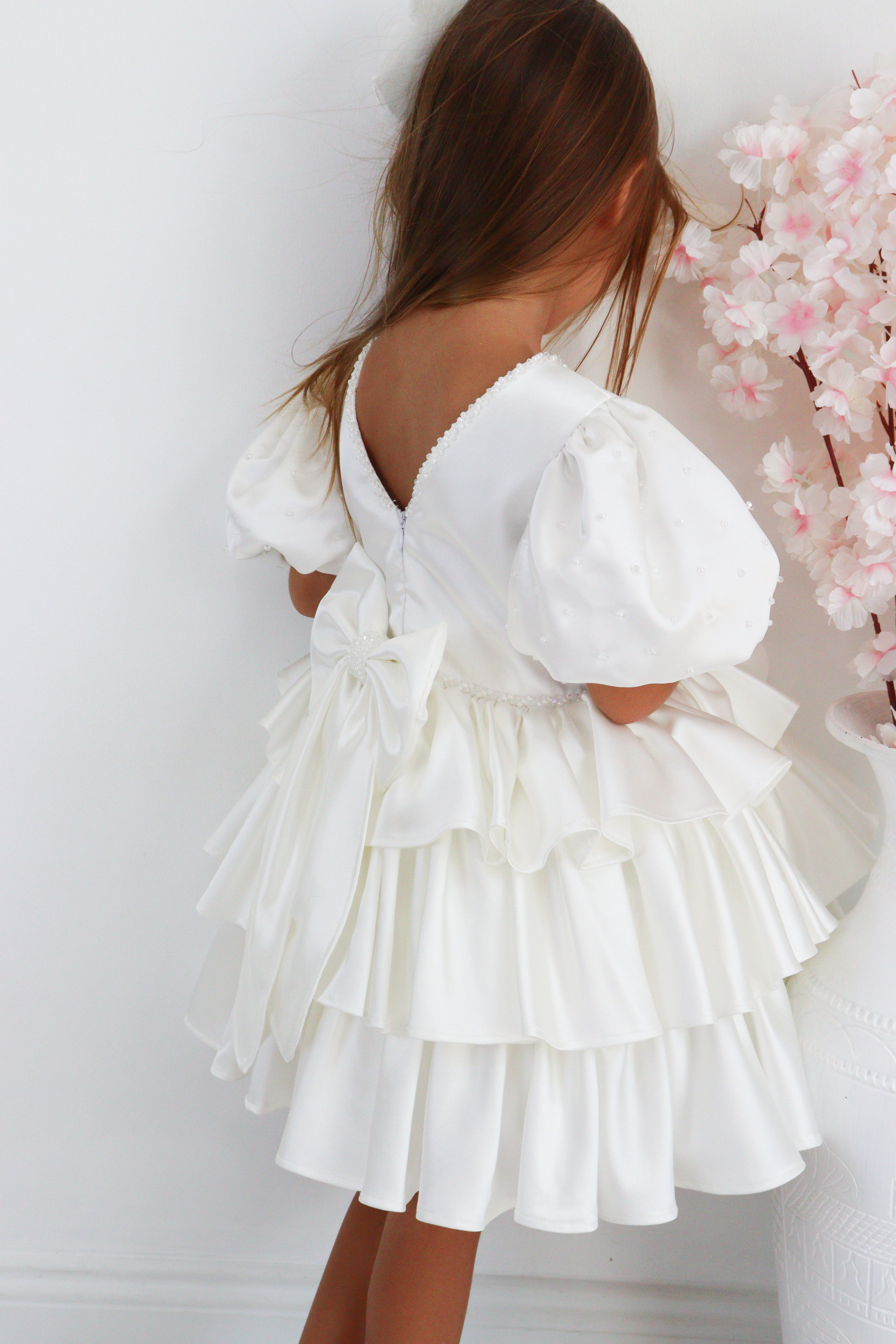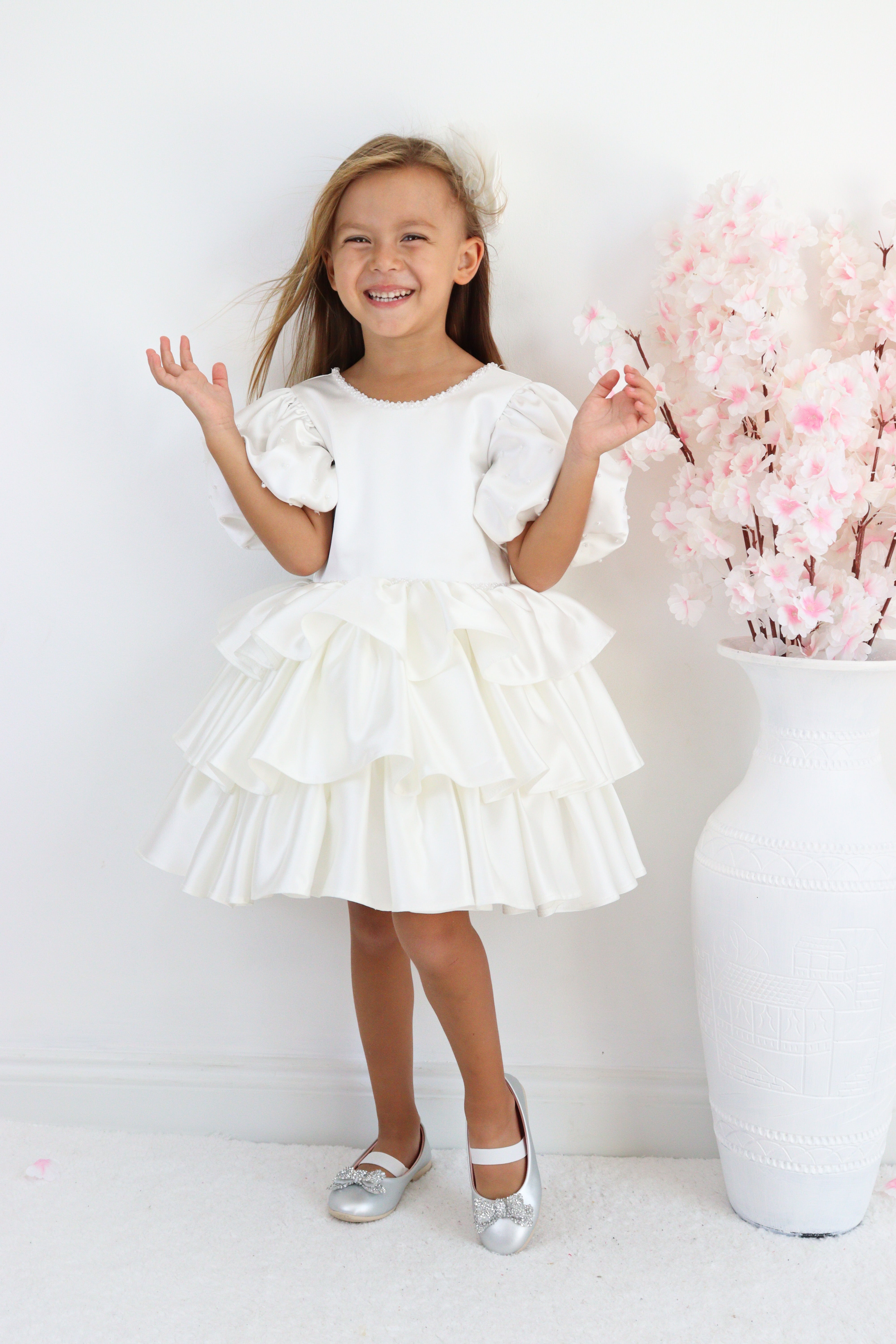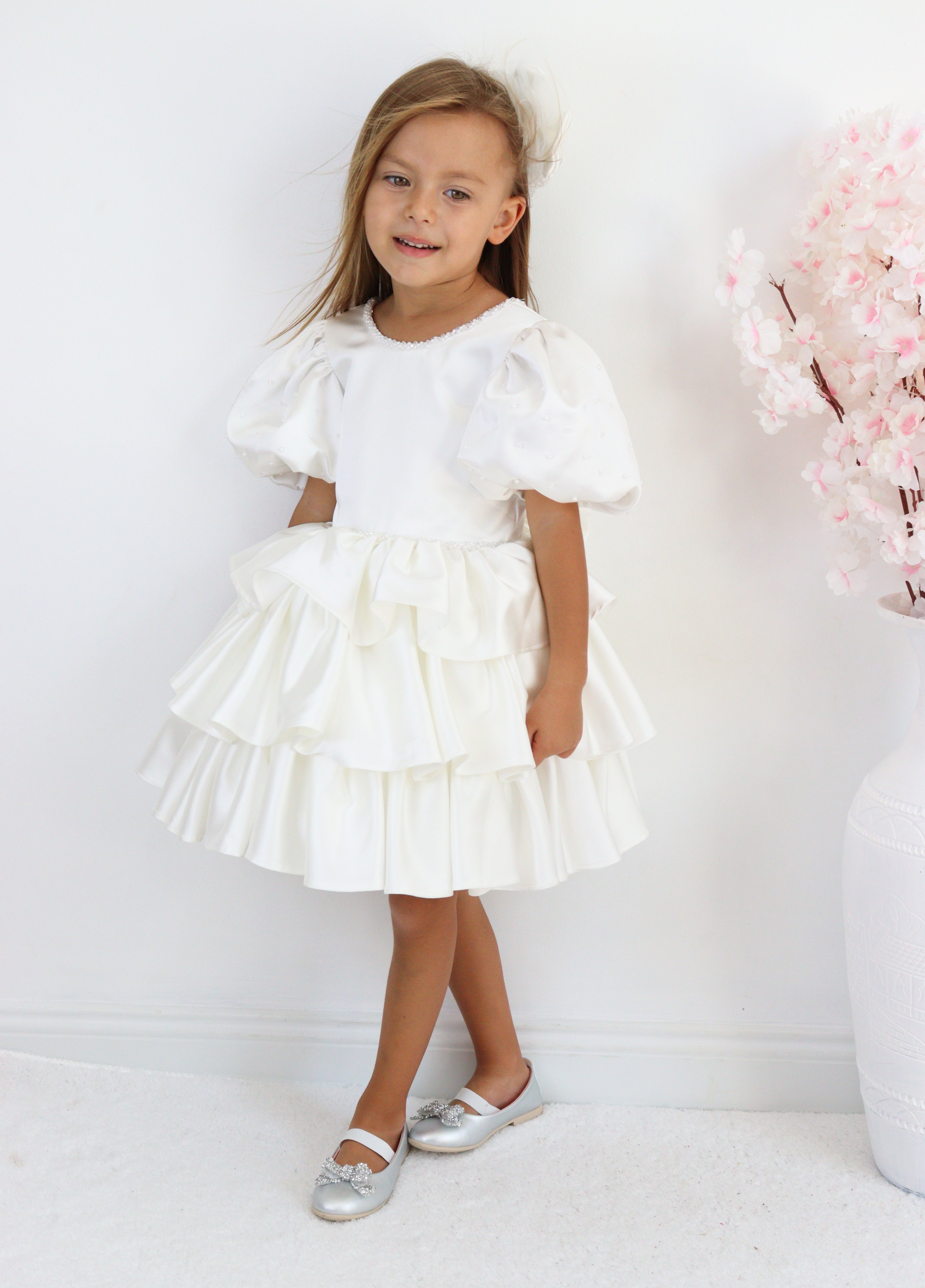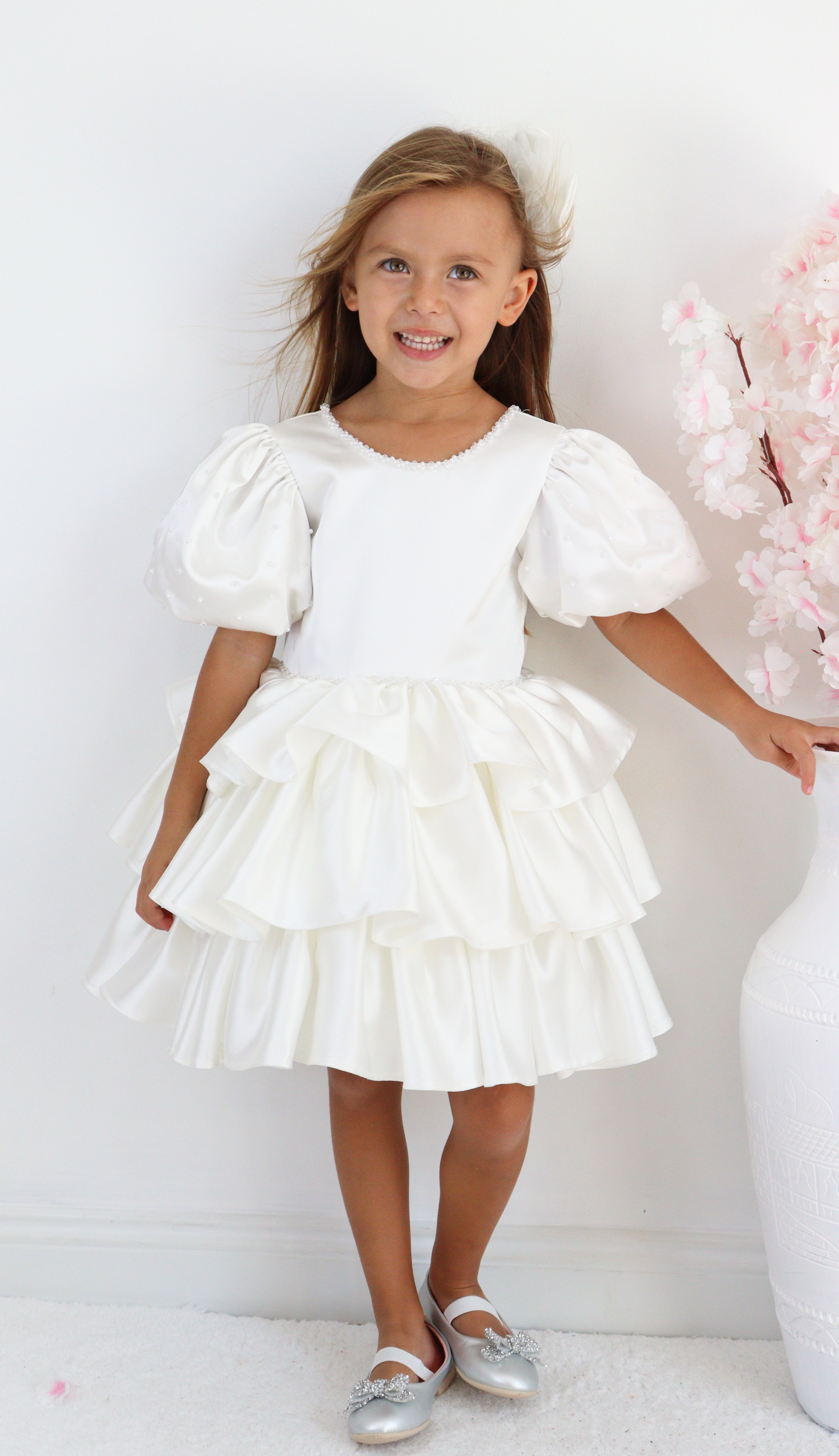 Küçük prenseslerin doğum günü, düğün veya özel kutlamalarda parlaması için tasarlanan bu beyaz saten elbise, zarif ve kabarık görünümüyle dikkat çeker. Kat kat volanlı eteği, kabarık balon kolları ve inci detaylı yaka formuyla asil bir duruş sunar.