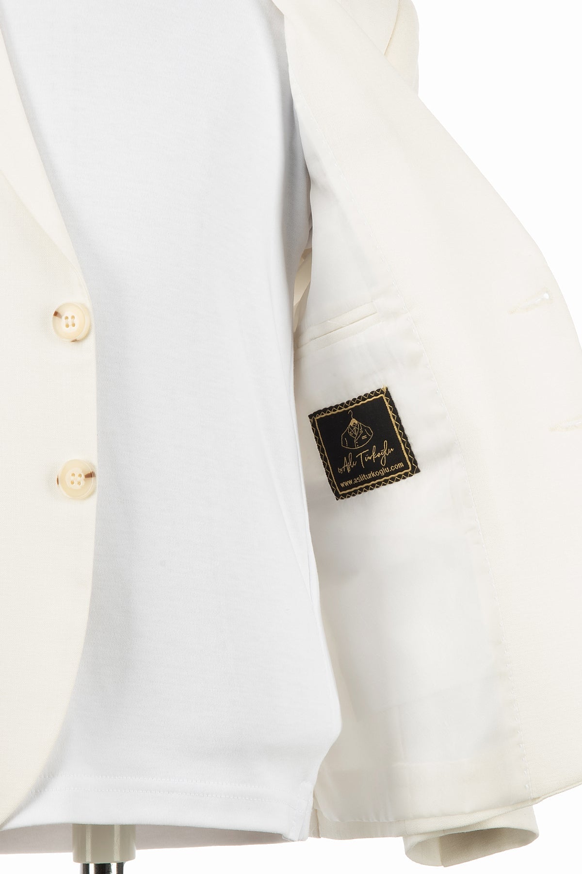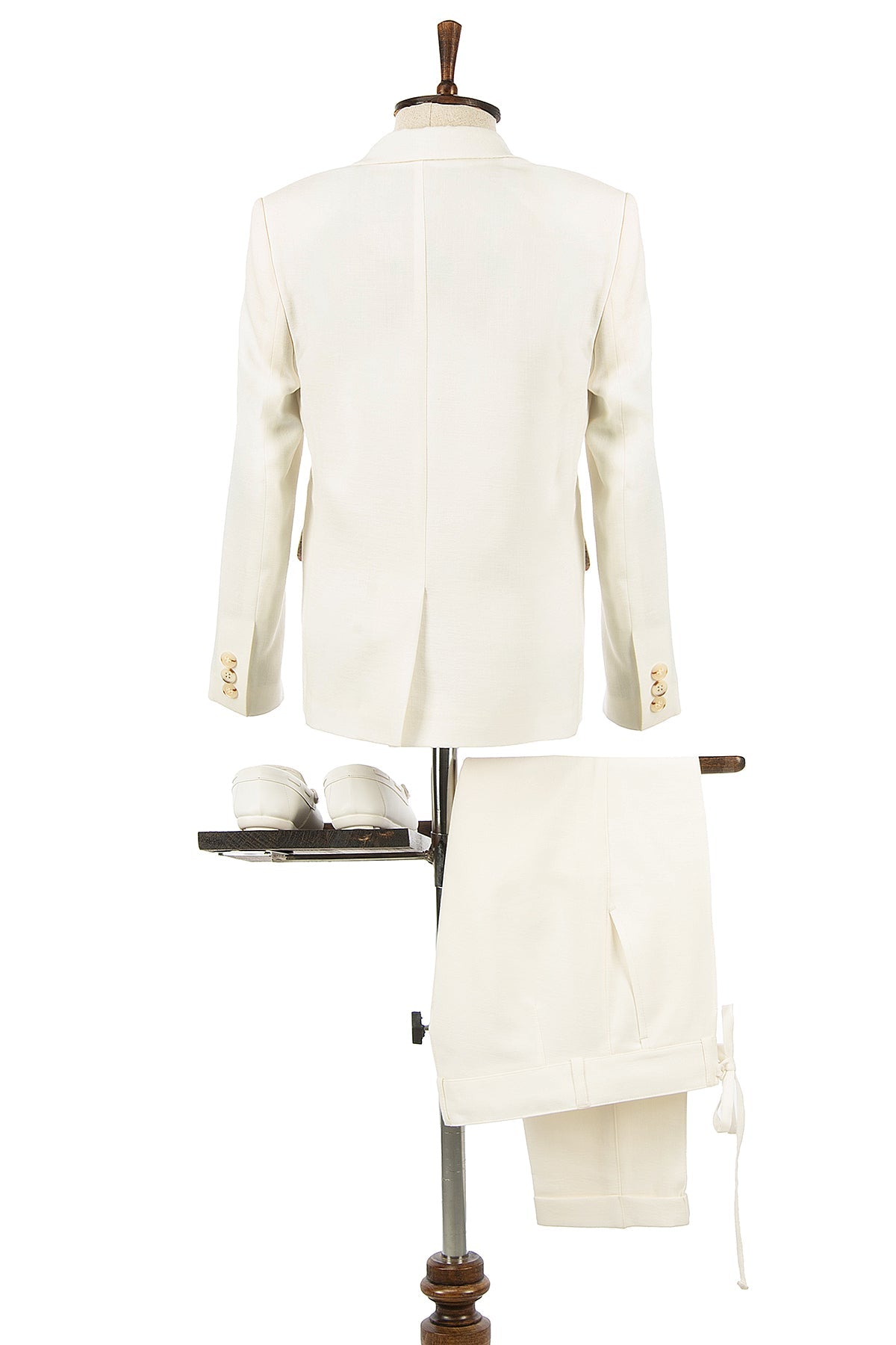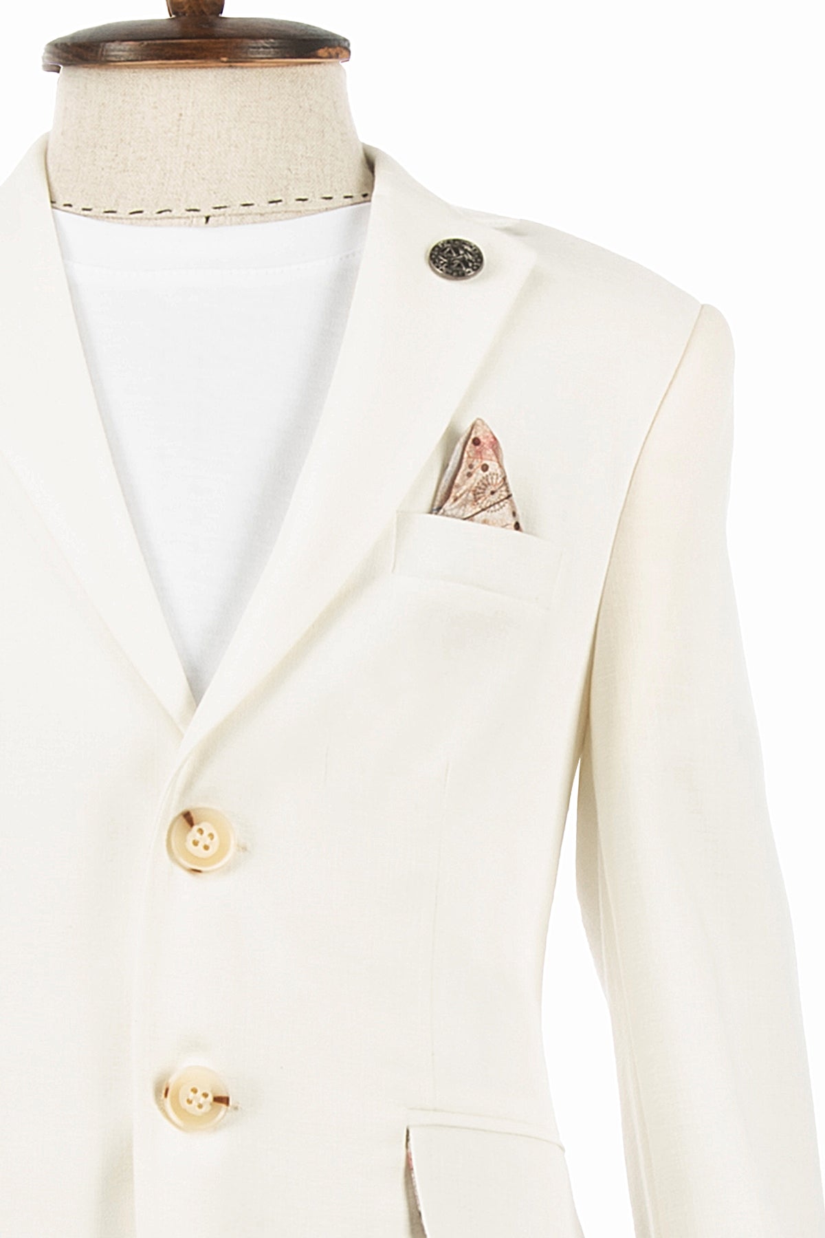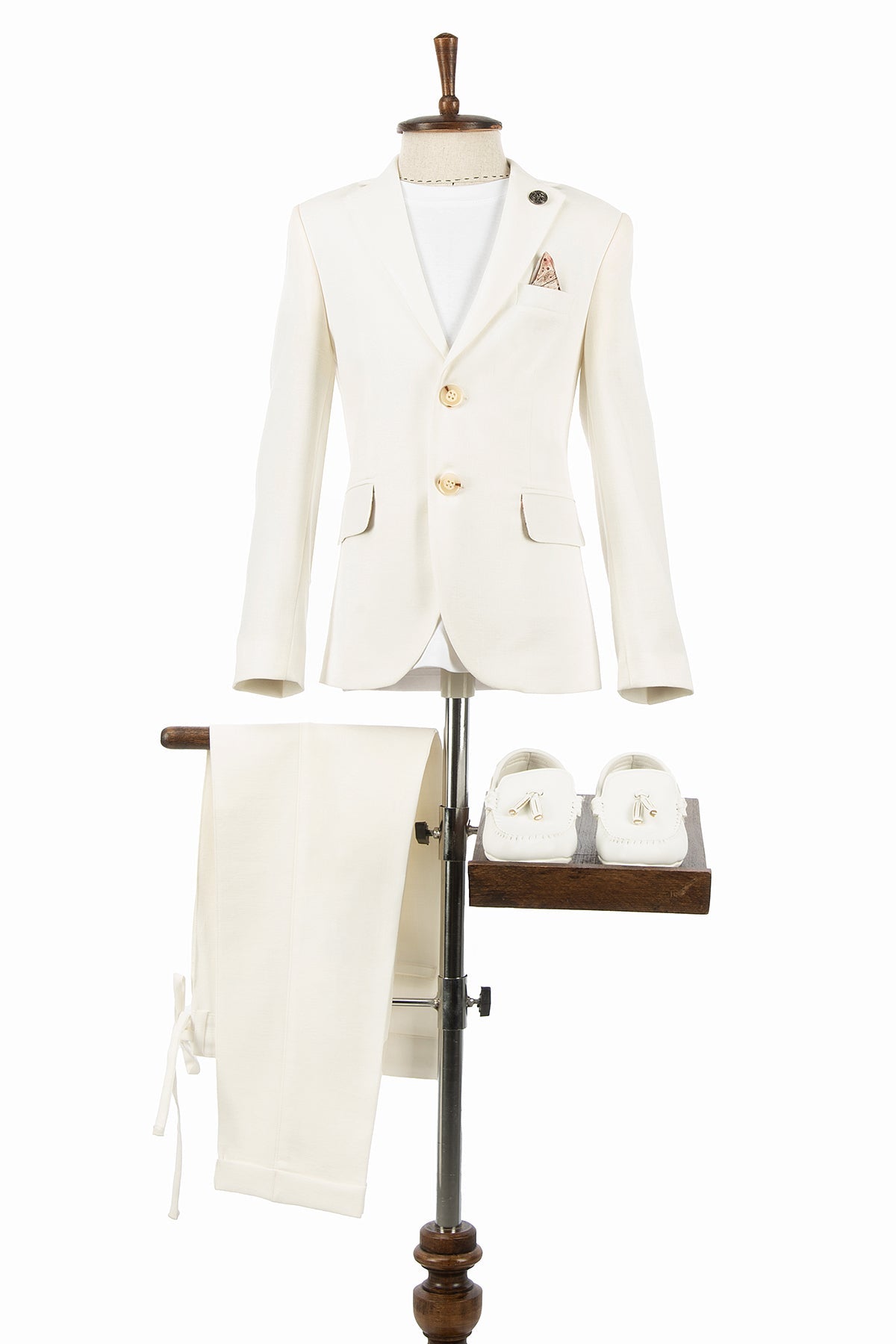 Aslı Türkoğlu Kids Atelier’in özel yaz koleksiyonundan bu ekru keten dokulu çocuk takım elbise, sade duruşu ve zarif detaylarıyla modern bir görünüm sunar.
