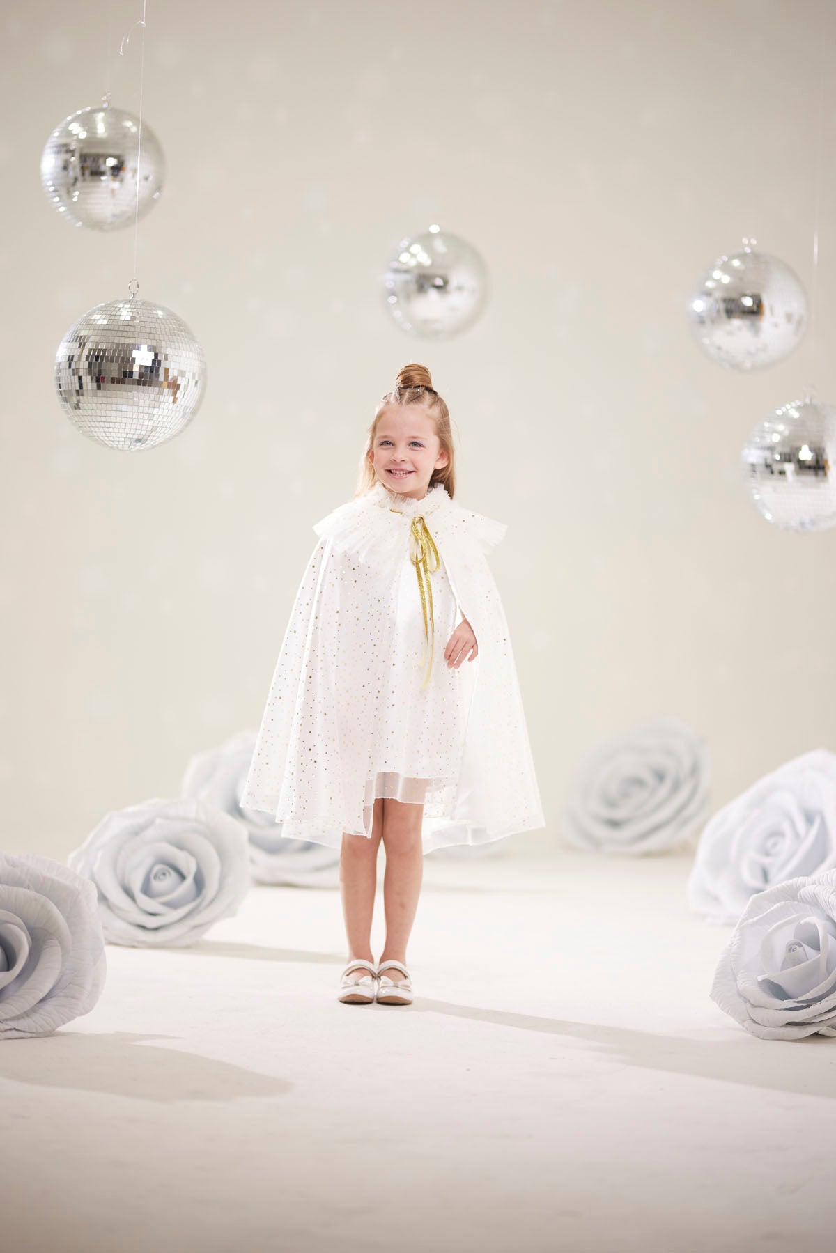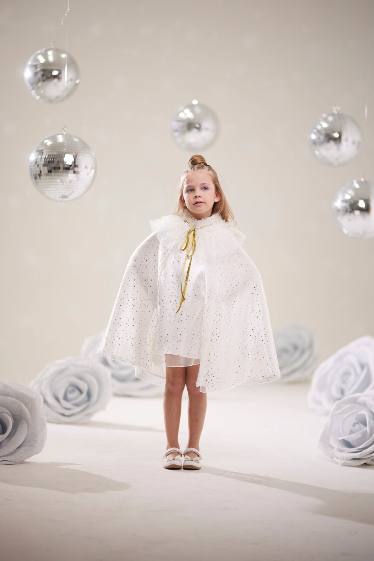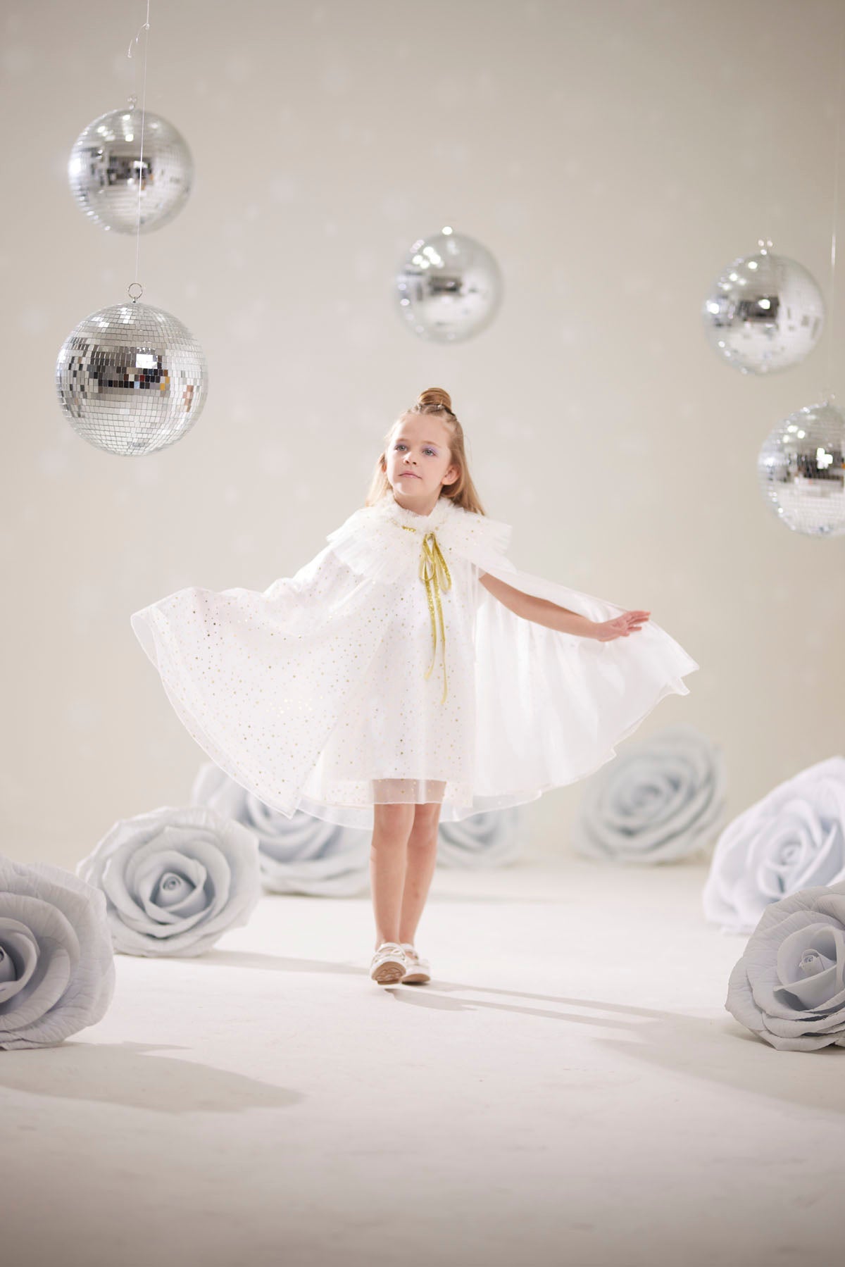 Aslı Türkoğlu Kids Atelier imzalı bu beyaz pelerinli komünyon, düğün, doğum günü ve yılbaşı gibi özel günlerde parıltılı ve masalsı bir görünüm sunar. Hafif ve akışkan tül katmanları, fırfır yakalı pelerin ve altın bağcık detayıyla modern bir siluet oluşturur.