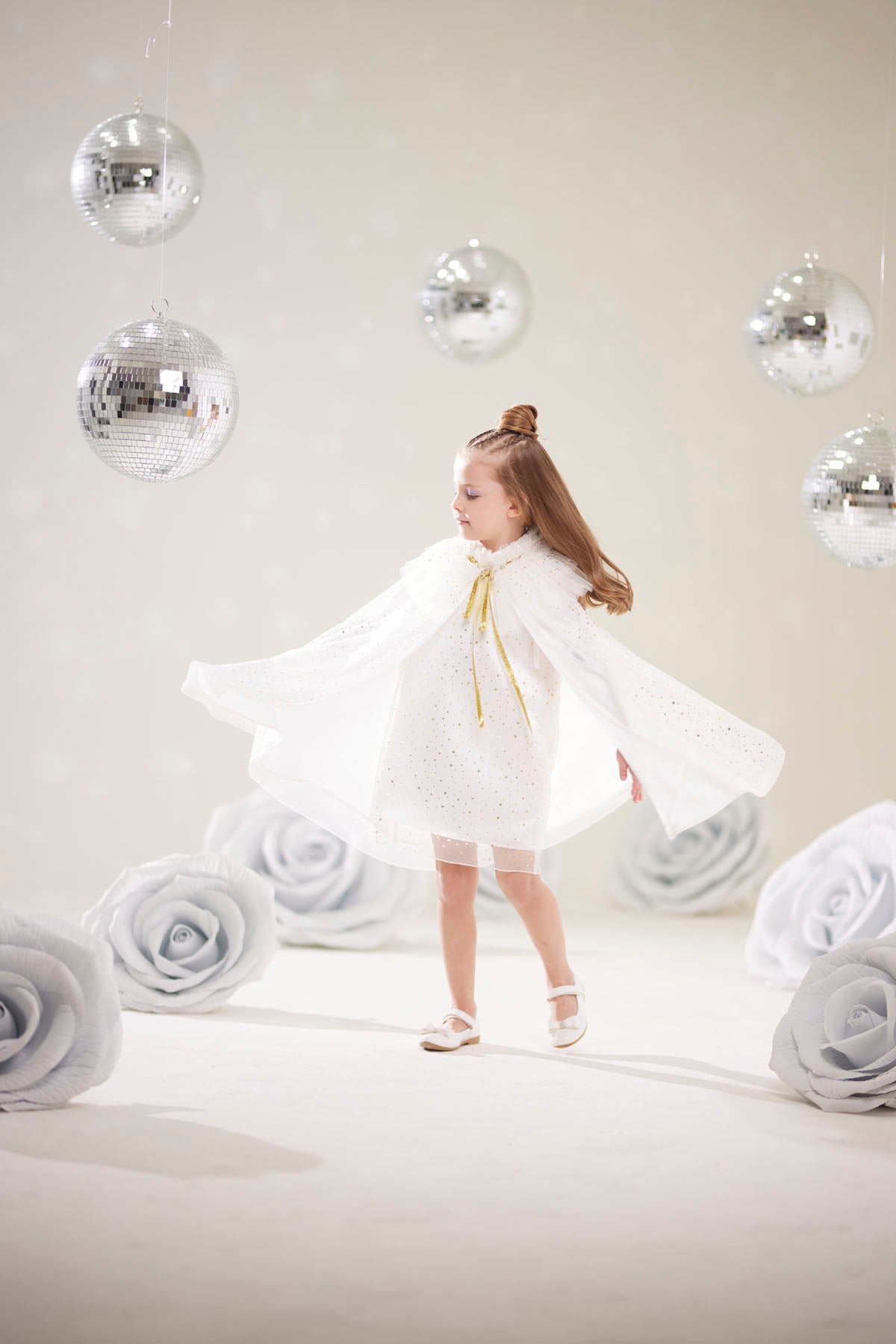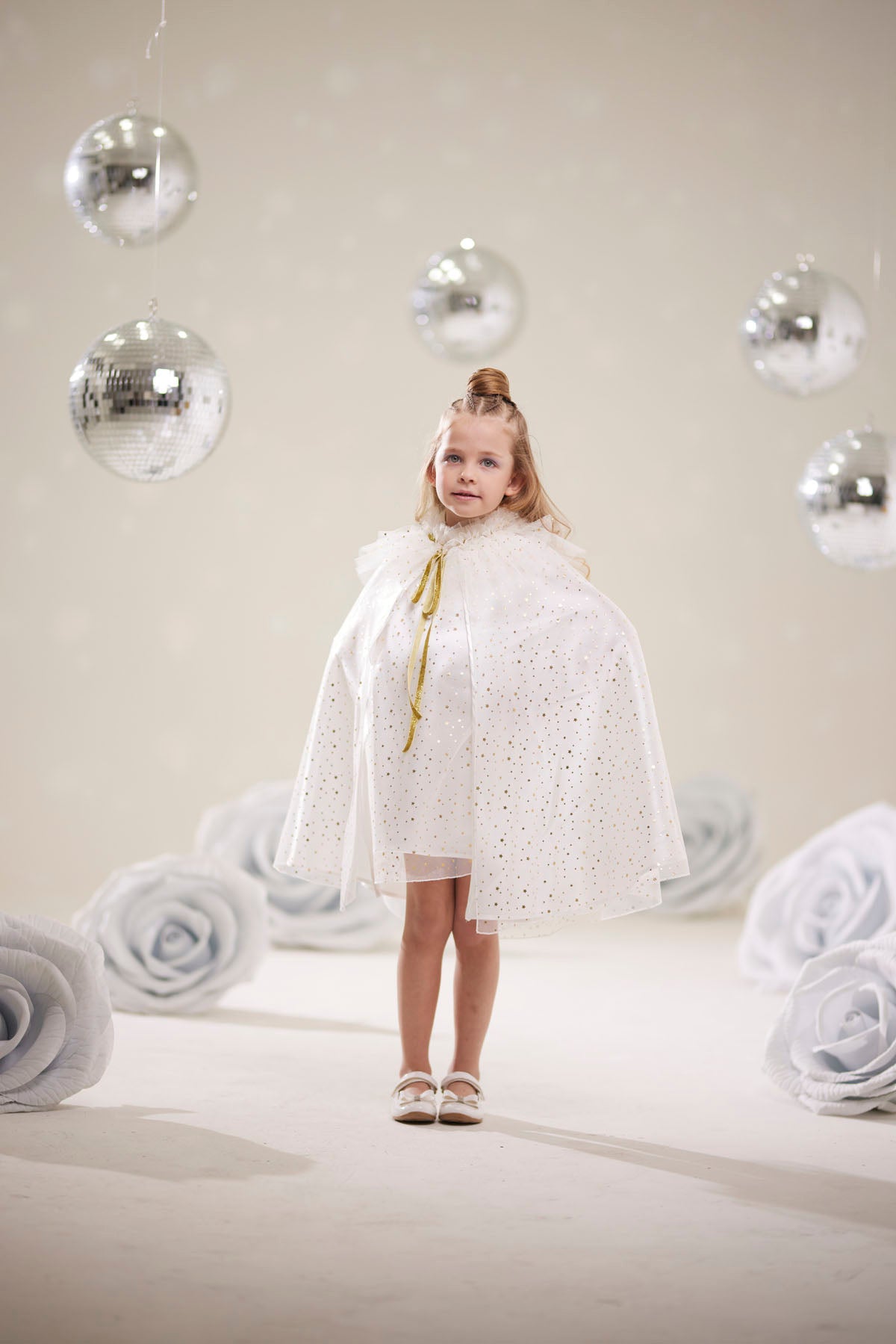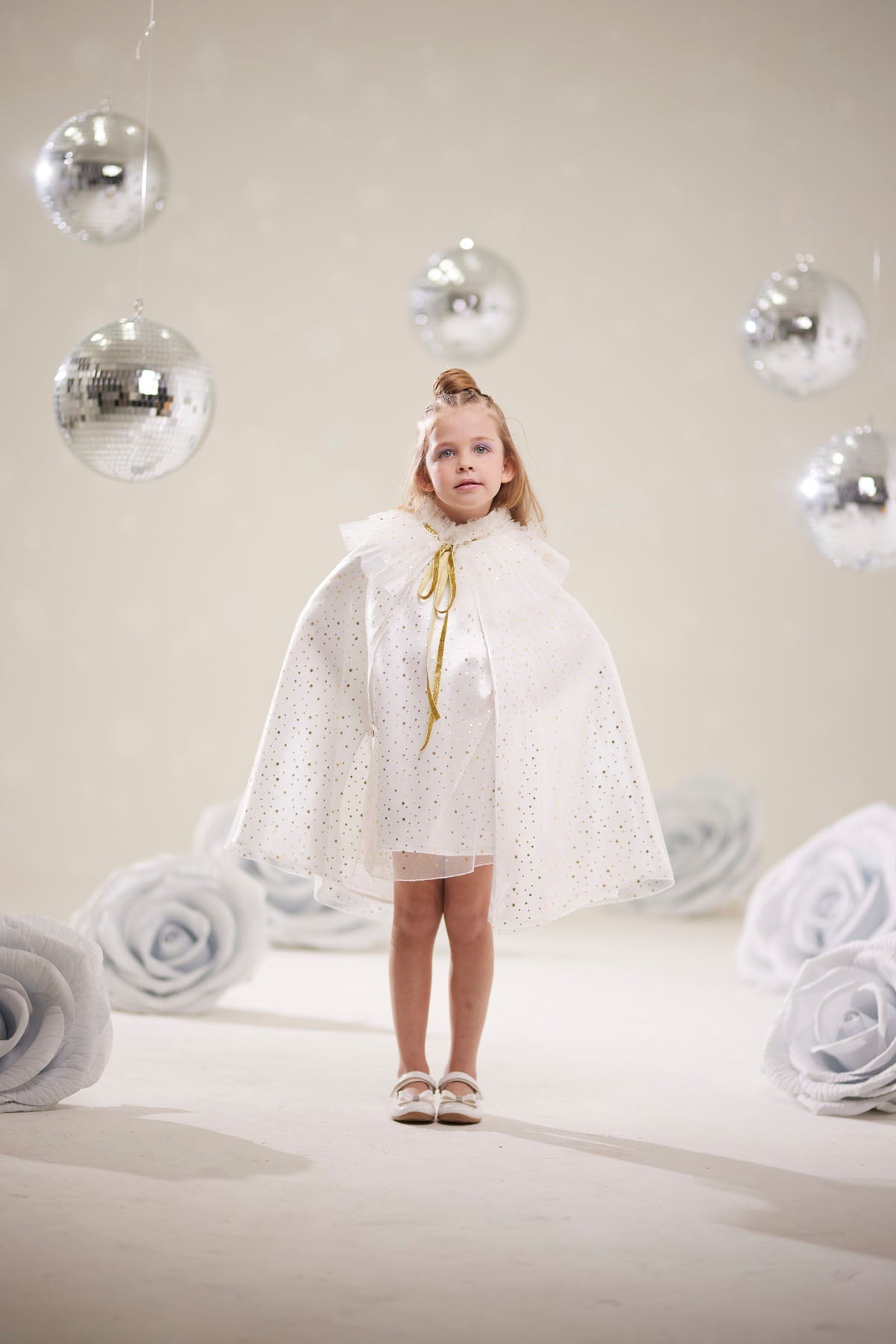 Aslı Türkoğlu Kids Atelier imzalı bu beyaz pelerinli komünyon, düğün, doğum günü ve yılbaşı gibi özel günlerde parıltılı ve masalsı bir görünüm sunar. Hafif ve akışkan tül katmanları, fırfır yakalı pelerin ve altın bağcık detayıyla modern bir siluet oluşturur.