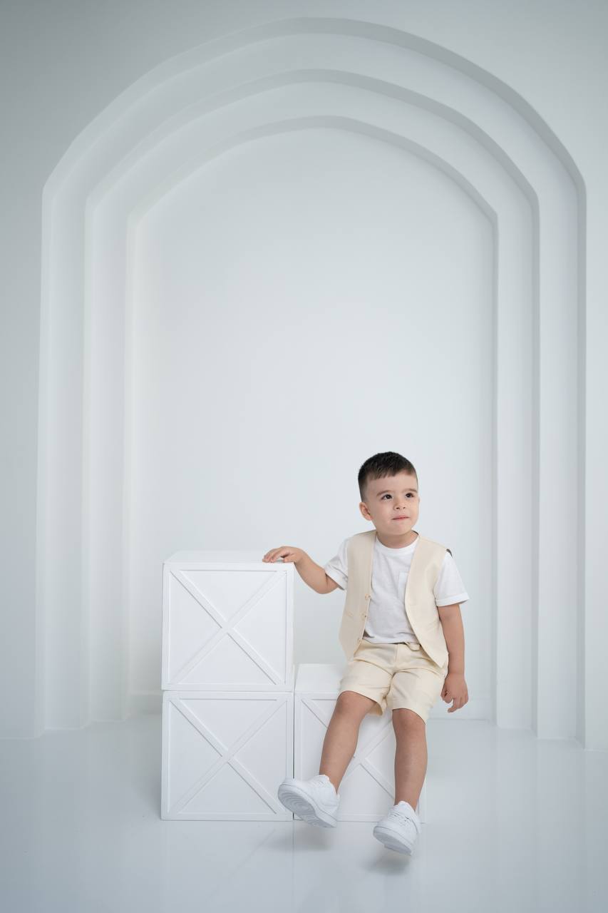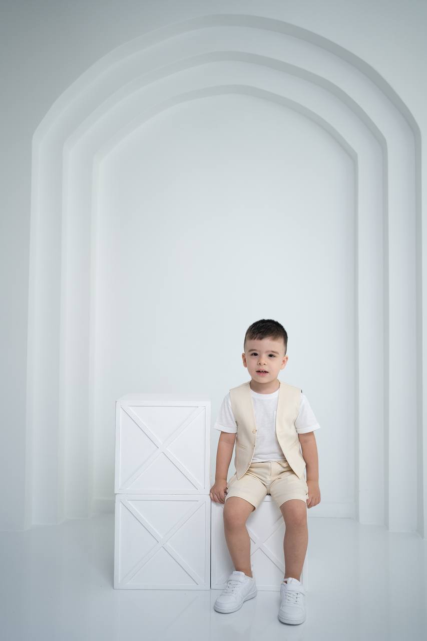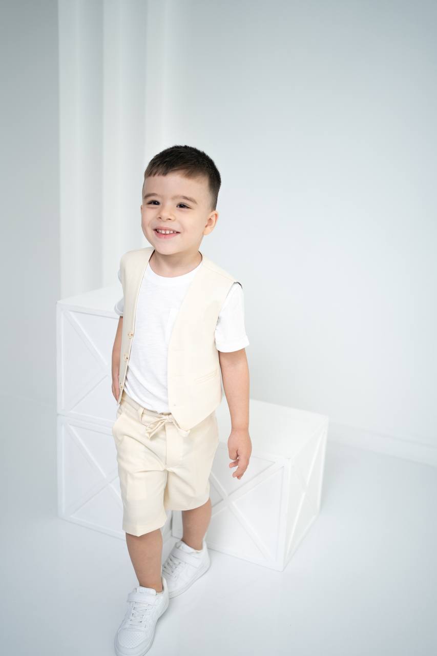 Çocuk Keten Yelek Şort Tişört 3’lü Takım – Krem