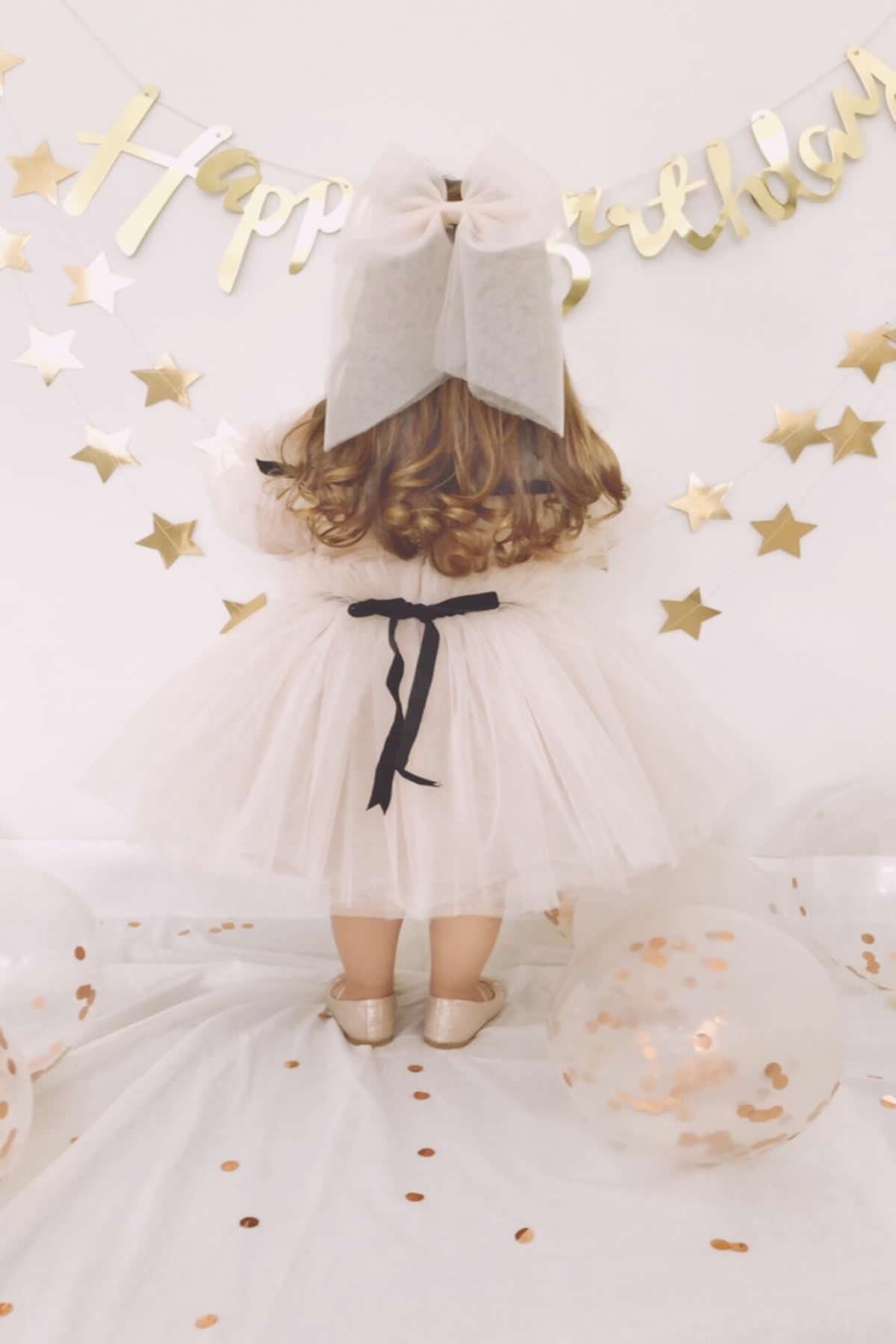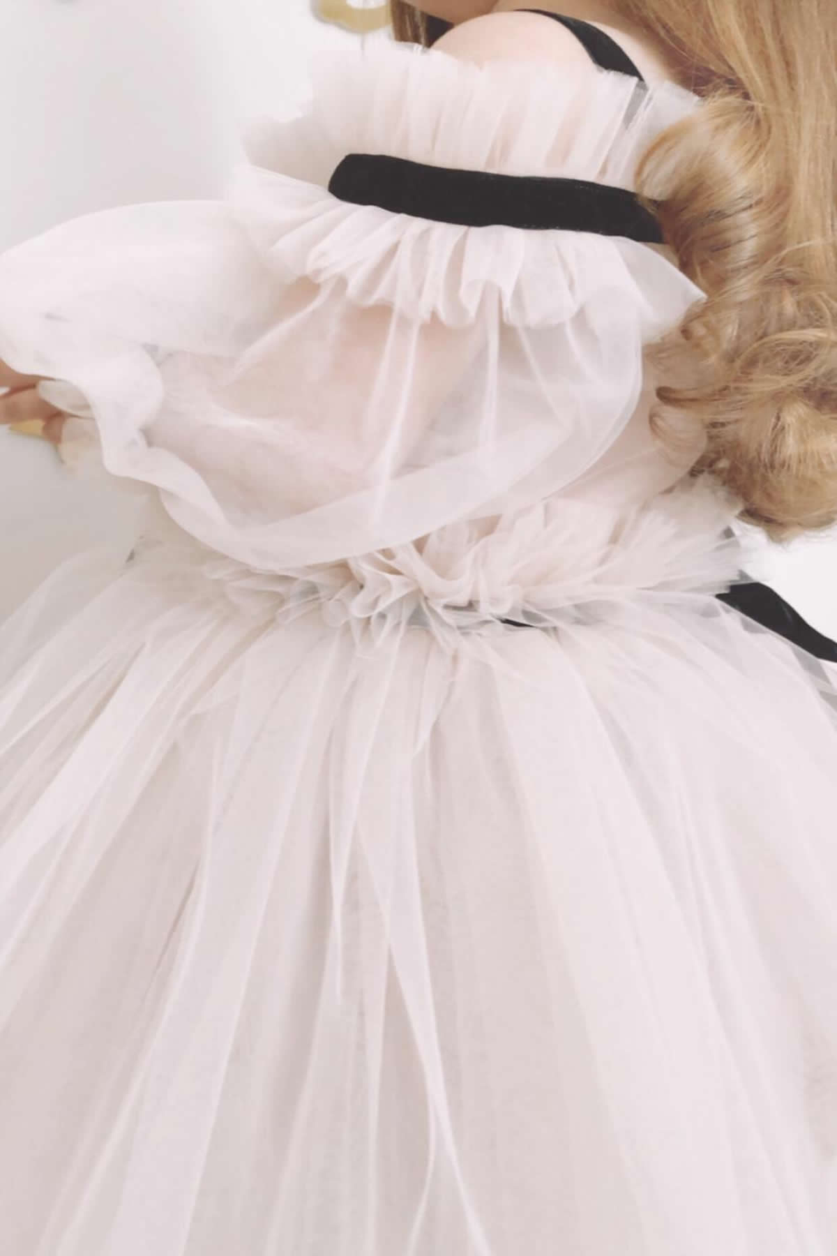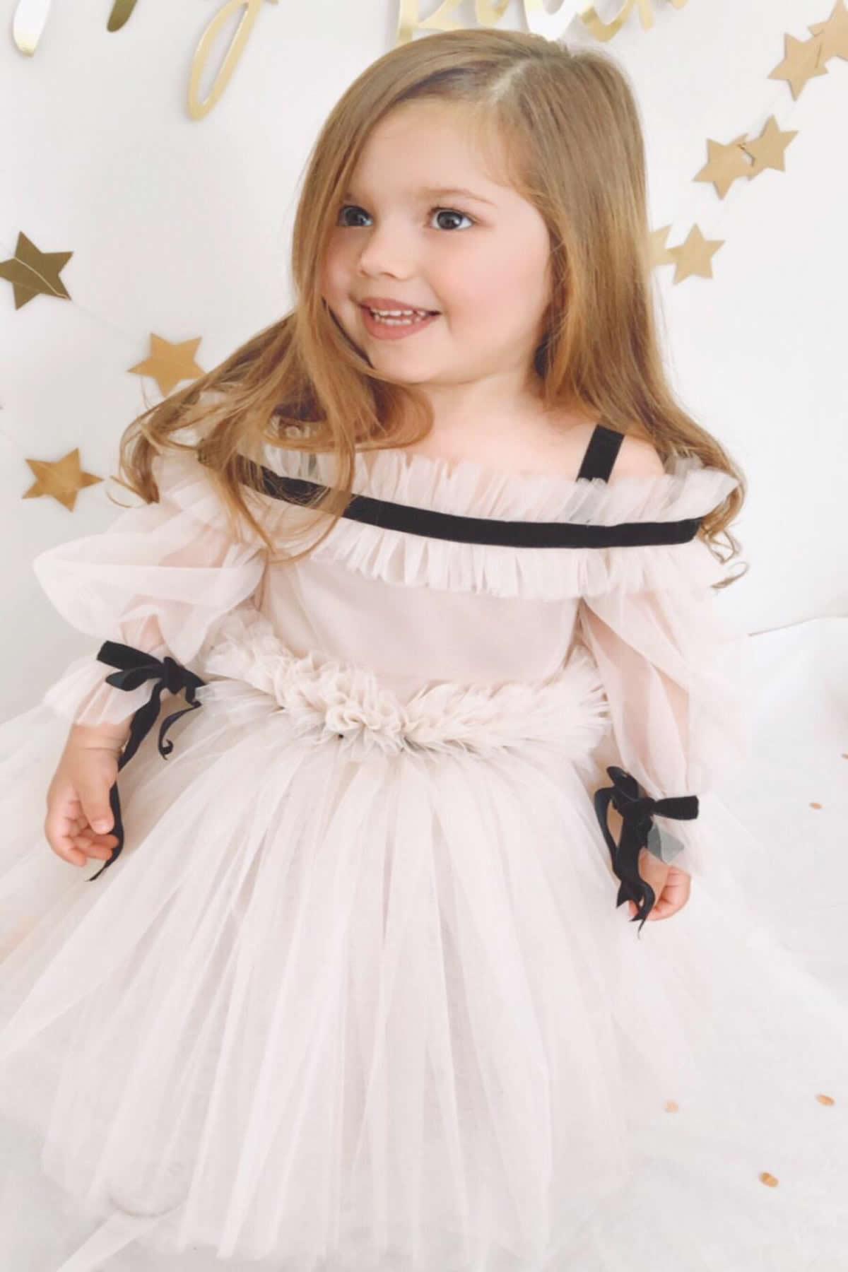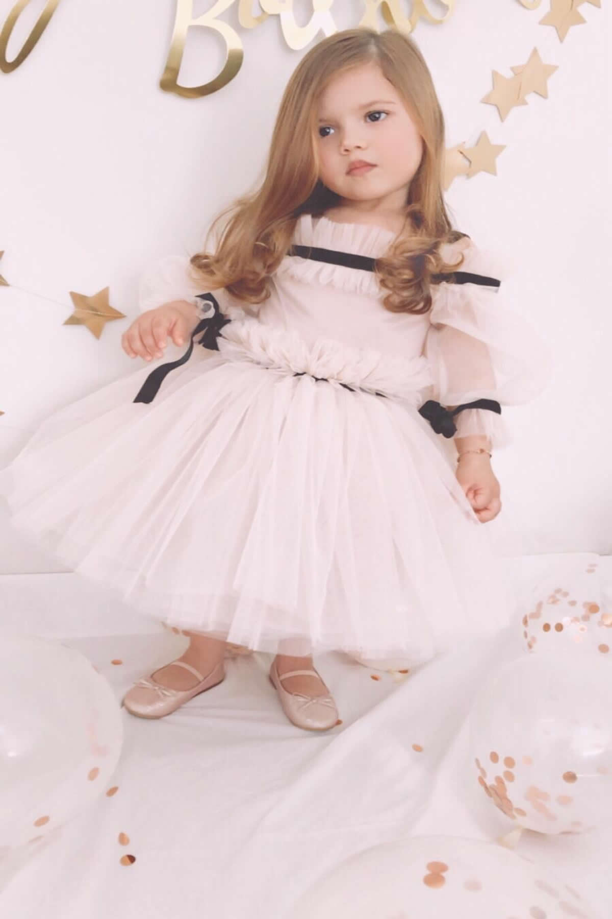 Kız Çocuk Pudra Tül Prenses Elbisesi – Siyah Kurdele Detaylı
