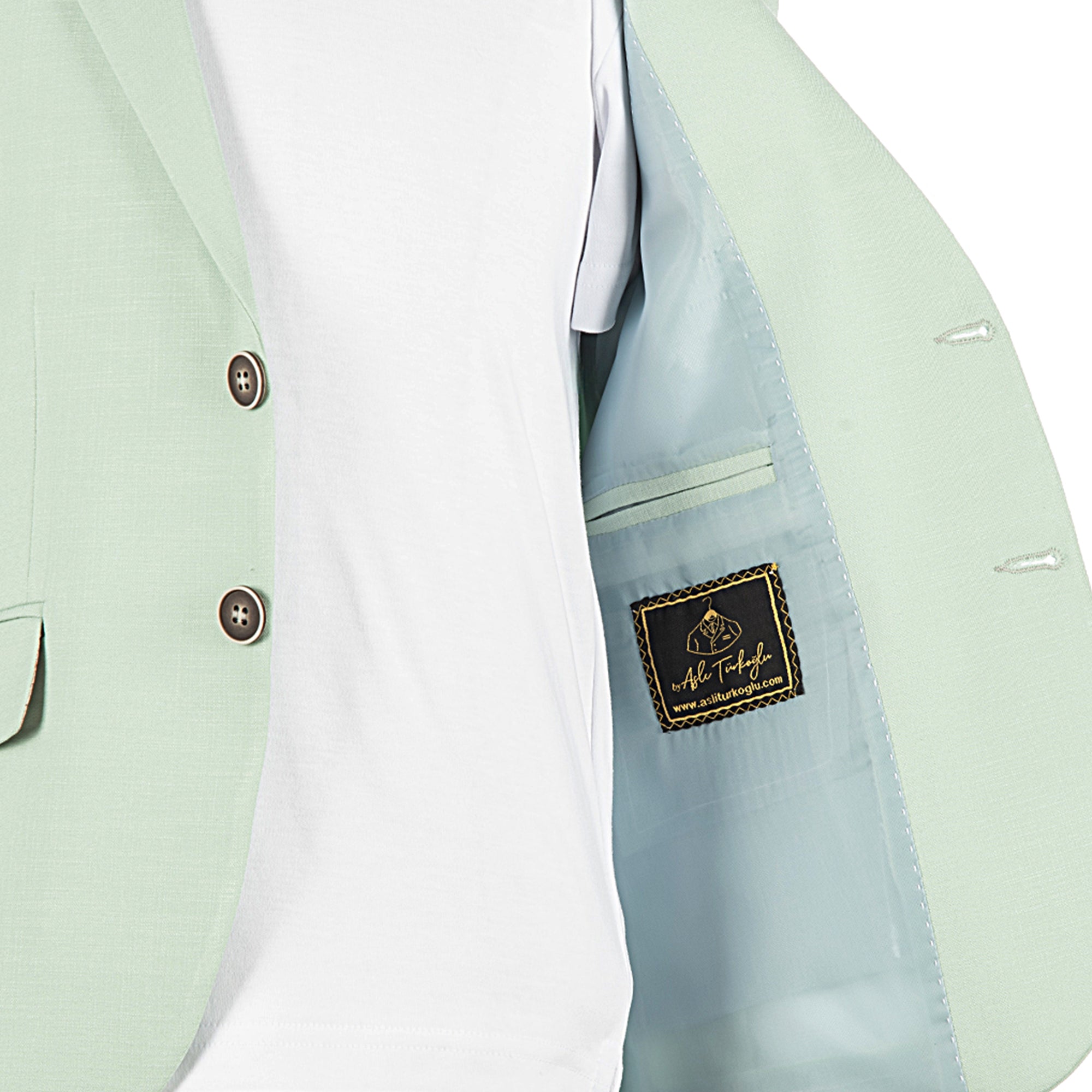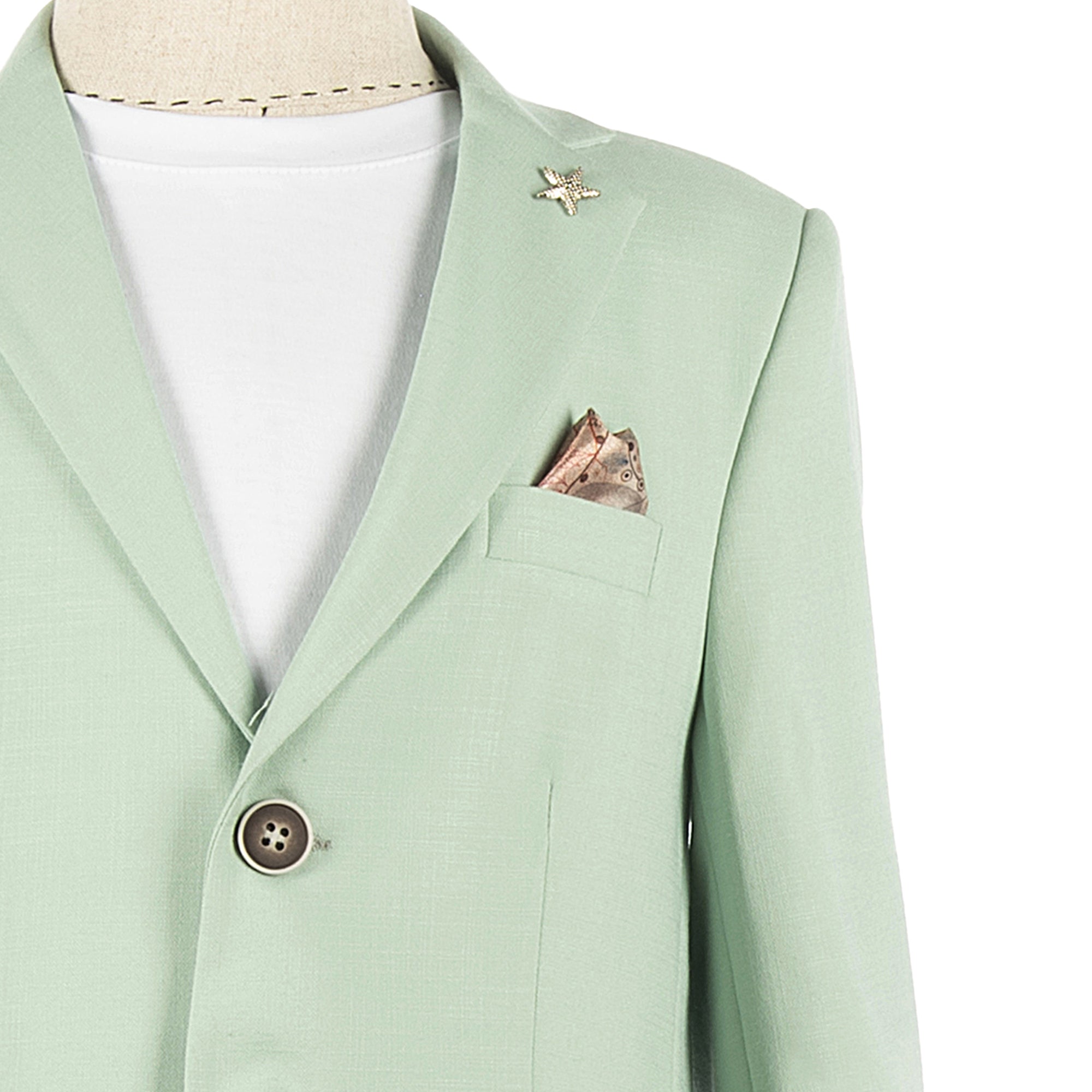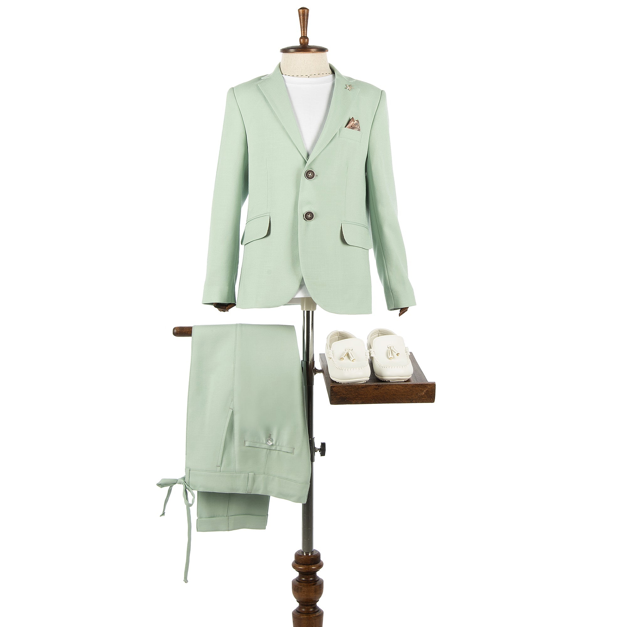 Aslı Türkoğlu Kids Atelier’in özel koleksiyonundan bu mint yeşili keten görünümlü çocuk takım elbise, sade tasarımıyla zamansız bir şıklık sunar.