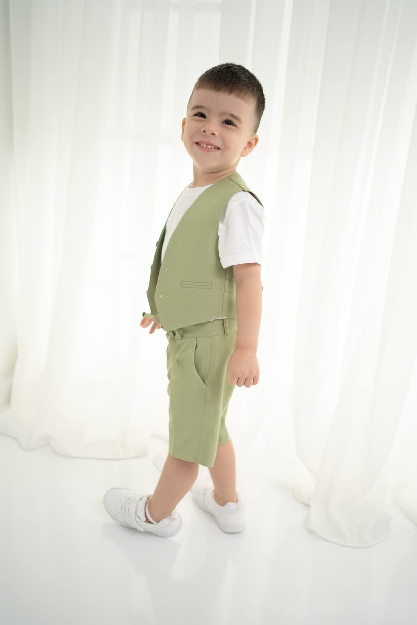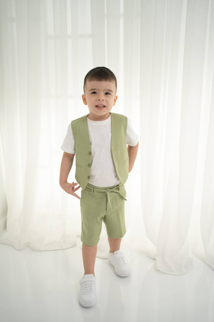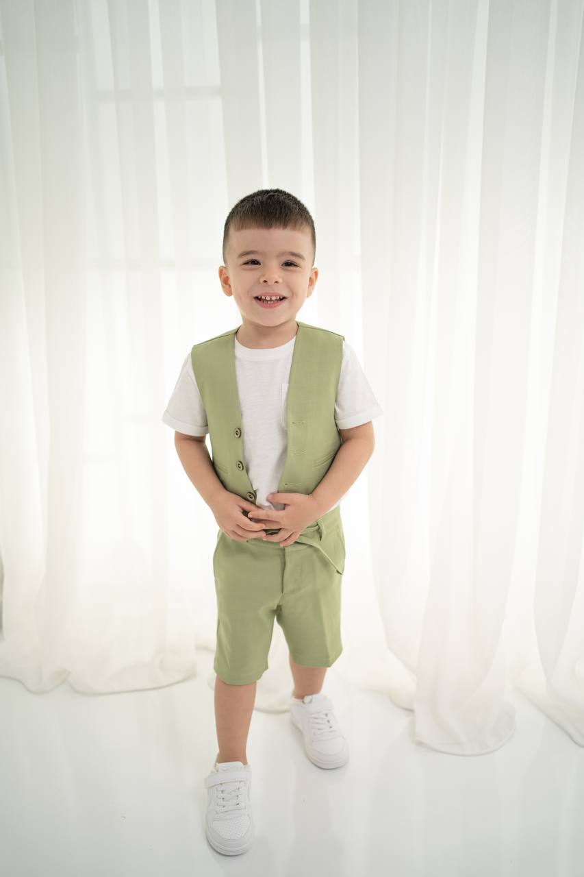 Yeşil Keten Yelek Şort ve Tişört 3'lü Set - Çocuk Takımı (1-10 Yaş)