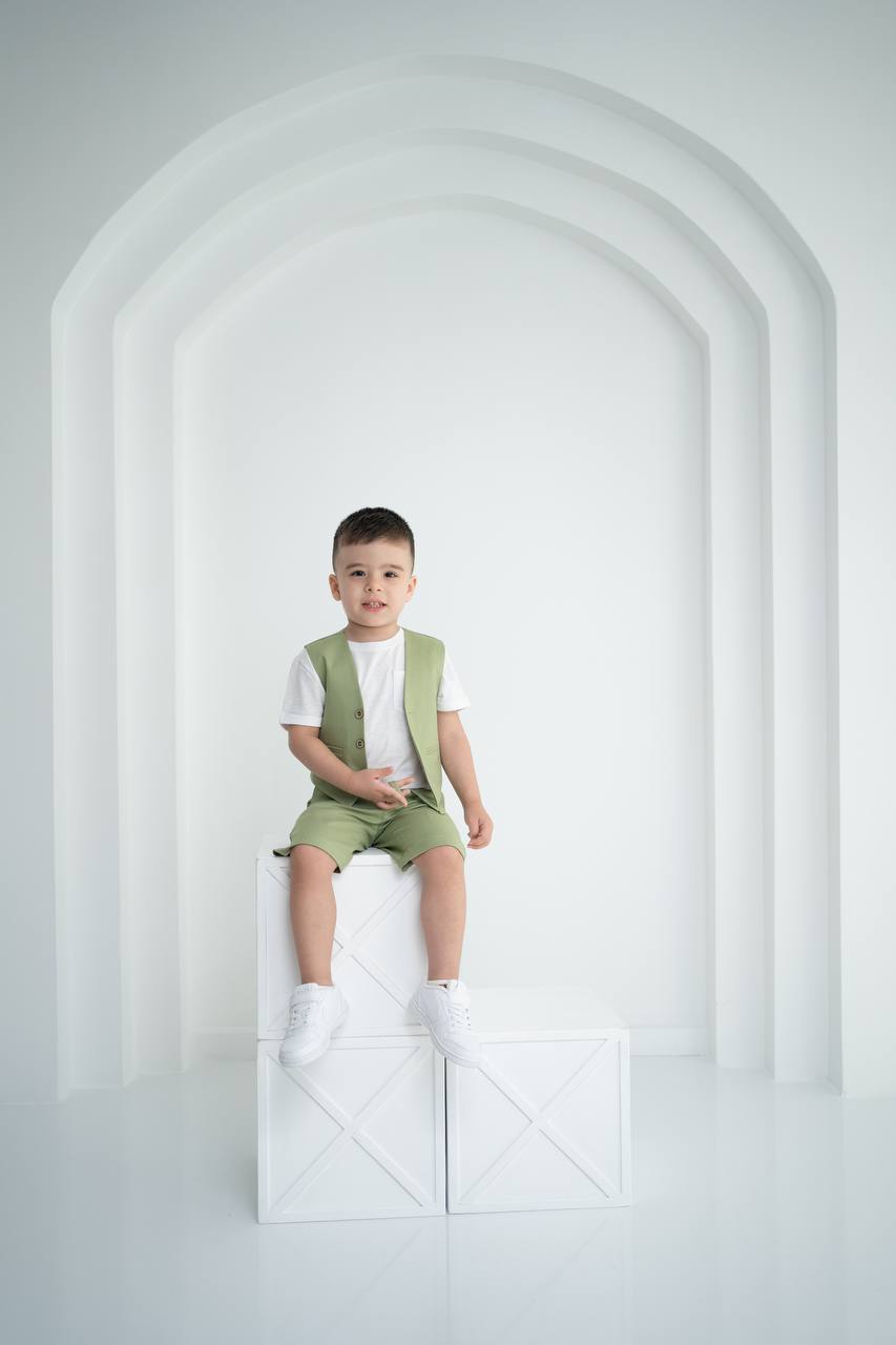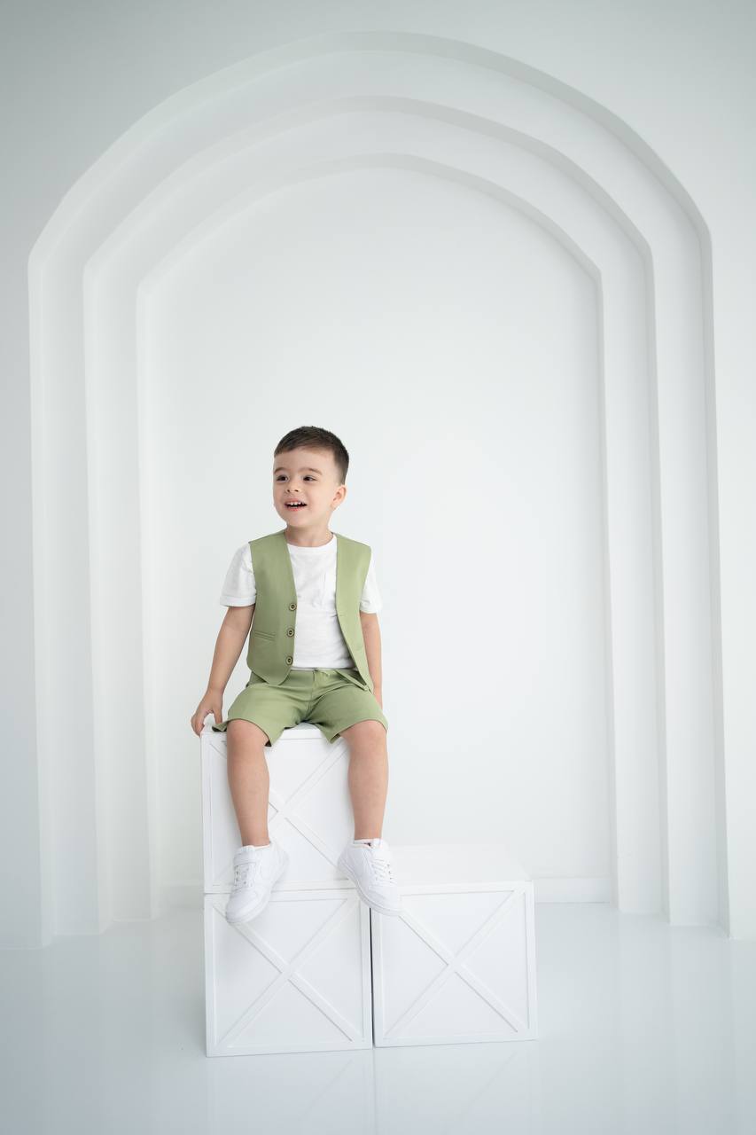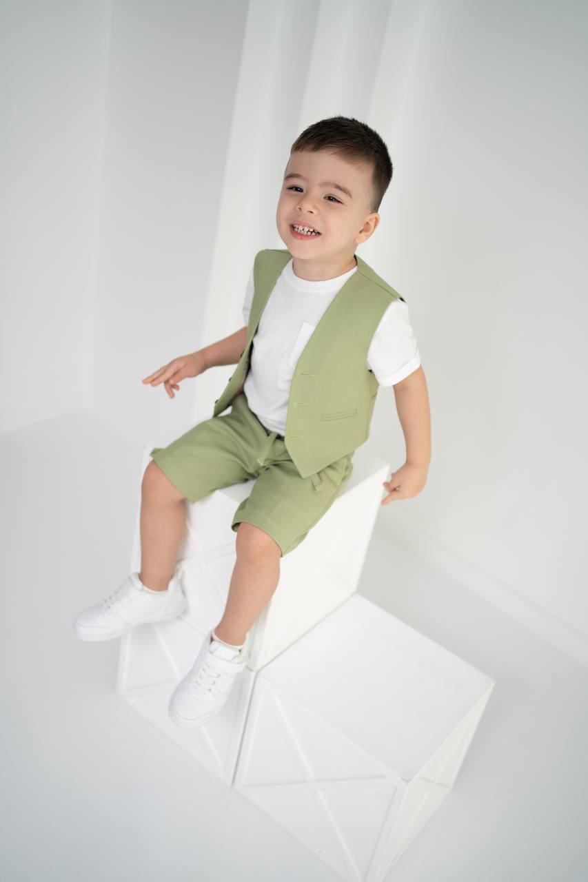 Yeşil Keten Yelek Şort ve Tişört 3'lü Set - Çocuk Takımı (1-10 Yaş)